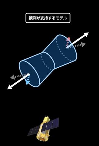 「W49B」は通常のリング状の超新星残骸とは異なるひしゃげた形をした天体です(図1)。その3次元構造は長年の謎で、これまでは、中心から外側へ円盤状に膨らんだ形を横から見ているとする説が有力でした。ところが、XRISMによる観測で残骸を構成するガスの運動が詳しく解析され、これまでの説を覆す新たな姿が浮かび上がりました。一方の端は地球に向かって近づき、もう一方は遠ざかっており、中央付近は大きく動いていないことが分かったのです。この結果から導き出されたのは、「鼓(つづみ)」のような双極構造。なぜ「W49B」がこのような形になったのか、その全てが解き明かされたわけではありませんが、今回の観測によって特異な3次元構造が初めて判明しました。星の進化や爆発の理論に、新たな地平を切り開く発見といえます。