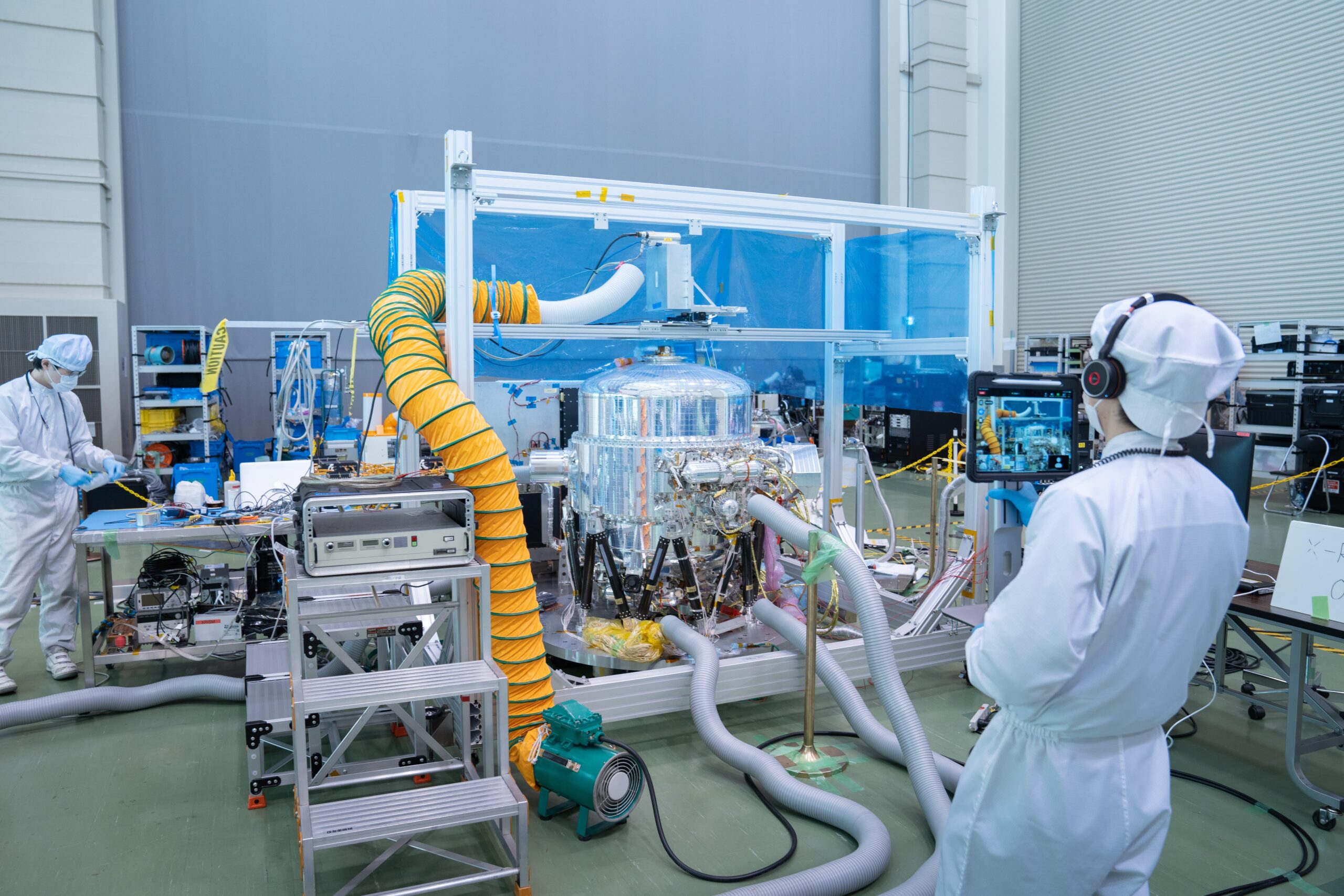 ガスの微細な運動を捉えたのが、マイクロカロリメータ「Resolve」です。X線のエネルギー量を正確に測るためには、センサーを絶対零度に限りなく近い50mK(ミリケルビン)まで冷却し、その温度を±2.5μK(マイクロケルビン)という驚異的な精度で制御しなければなりません。そのため、わずか5ミリメートル四方のセンサーに対し、大人が手を広げても抱えきれないほどの大掛かりな冷却装置が組み込まれています。この繊細かつ壮大な装置のうち、センサーに近い部分はNASAが中心となって開発。一方、冷却装置の大部分やデジタル波形処理装置などは、JAXAが中心となり澤田助教・山田准教授・北本特別専任教授も主要メンバーとして参加する日本のチームが担当。国際協力のもと、かつてない観測精度の装置を作り上げました。(図3、4)