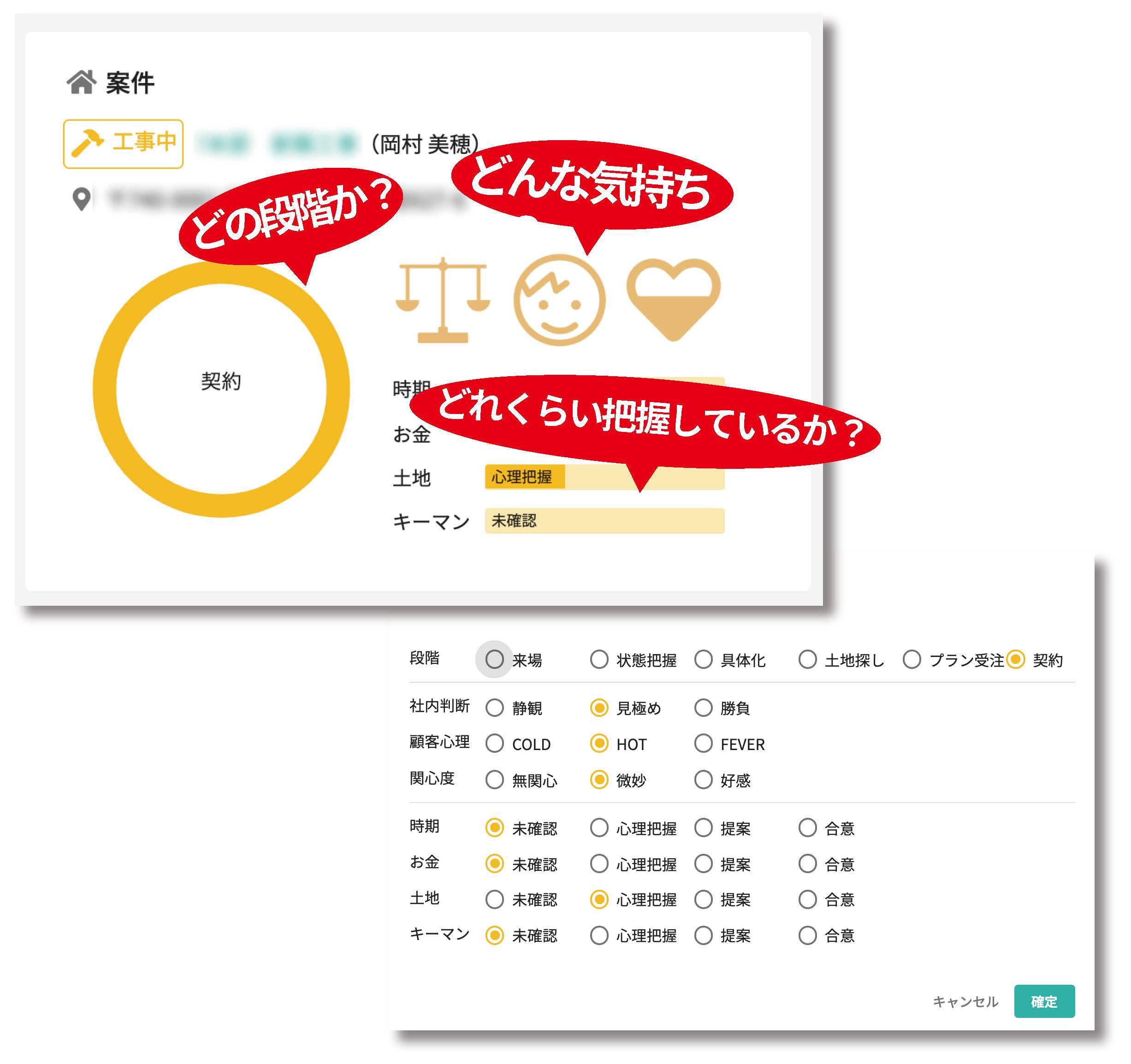 契約に至るまでに必要なプロセスや顧客の心理状態などの状況をひとつのブロック内に分かりやすく表示することで、営業活動時における「お客さまとの関係性やプロセスがどのような状況にあるか」をひと目で分かるようにしています。
