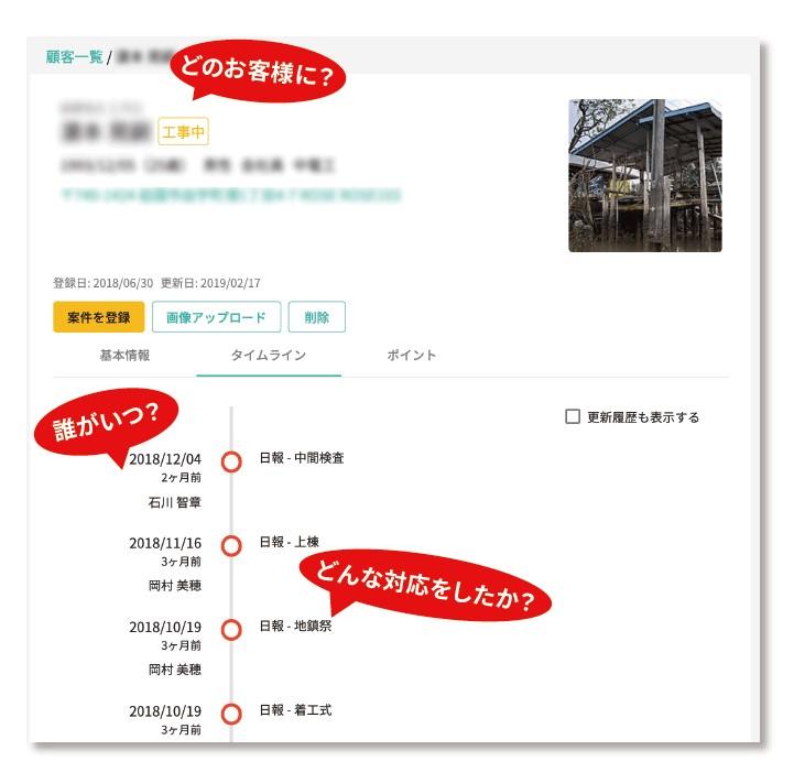 (2)顧客情報の更新履歴をタイムライン表示にすることで顧客ごとに「従業員の誰がいつどのような対応をしたか」を分かりやすく表示