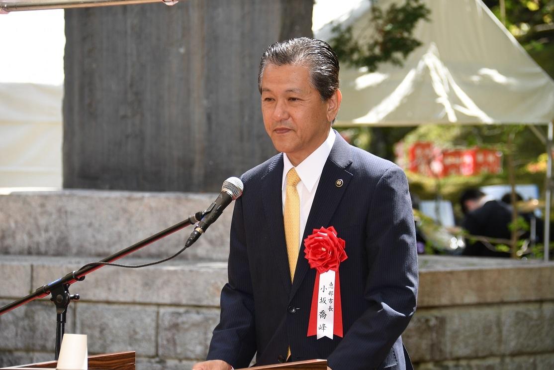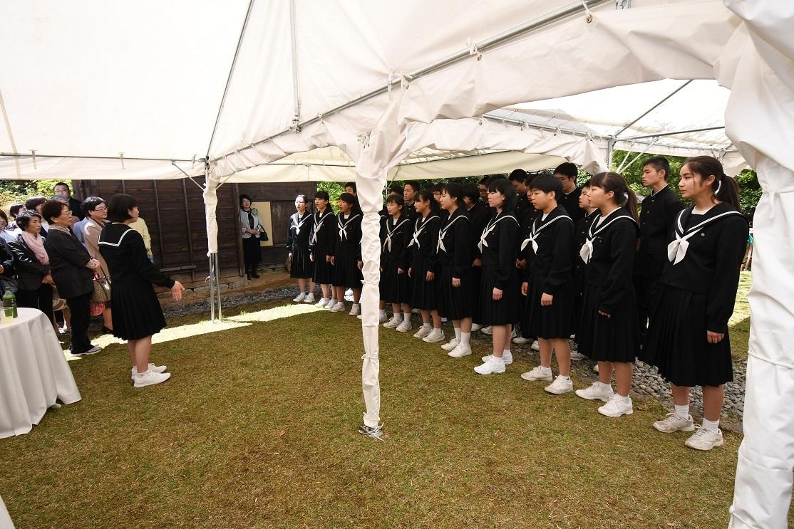 記念式典では、恵那市の小坂喬峰市長をはじめ、約140名の関係者が参加する中で、創立120周年を記念し建立した記念石碑の除幕式などを行いました。恵那市の小坂喬峰市長は、「創立者下田歌子先生の生誕の地の恵那市岩村町にて120周年の記念式典を開催される決断をされたことは、恵那市民にとっても大変名誉なことであり、山本理事長を始め、関係の皆様の英断に深く心から感謝を申し上げます。下田歌子先生も大変お喜びであると存じます。実践女子学園と恵那市は平成22年に連携協定を結ぶなど、多岐に亘り交流を深めてきました。令和の時代は、より一層の連携を深めていけたらと考えております。」と話しました。