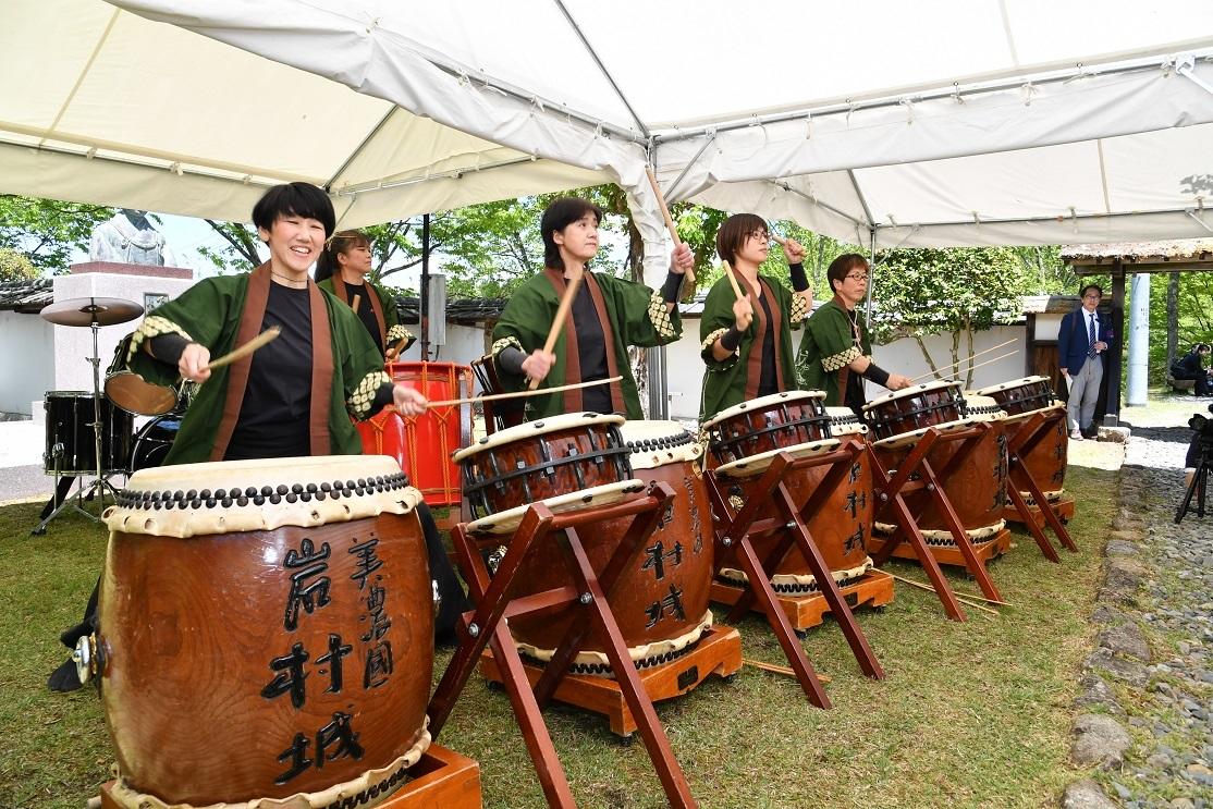 さらに、懇親会が下田歌子勉学所前広場(岐阜県恵那市岩村町)で行われて、アトラクションとして、地元の美濃国女太鼓や岩邑中学校生徒の合唱、恵那南高校ブラスバンド部の演奏が行われました。
