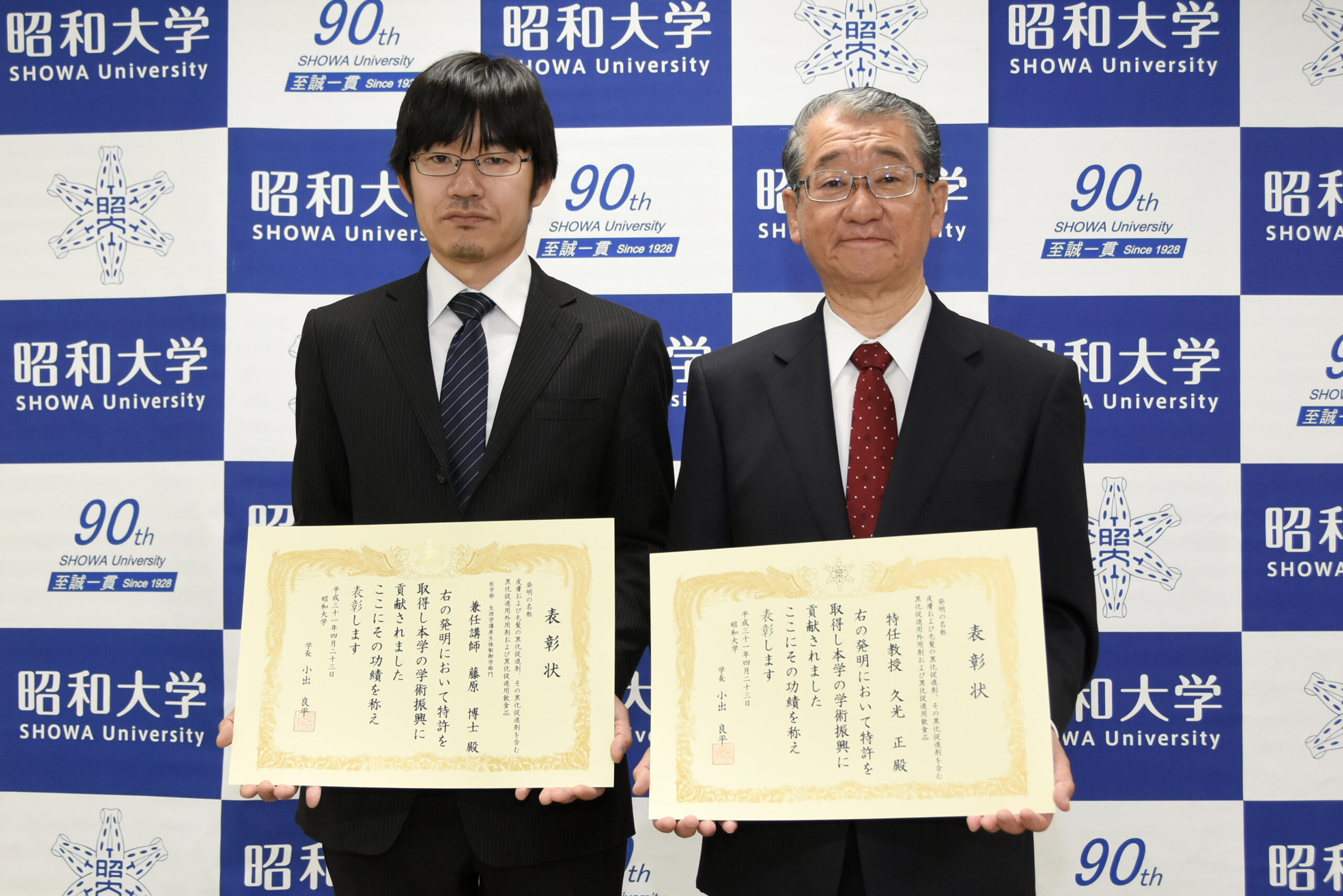 この度、この製剤の発明について、更なる新規性と進歩性が認められ、特許の取得となり、発明者の久光特任教授、藤原兼任講師に、小出学長により表彰されました。表彰式は、小川医学部長が同席され、平成31年4月23日に挙行されました。