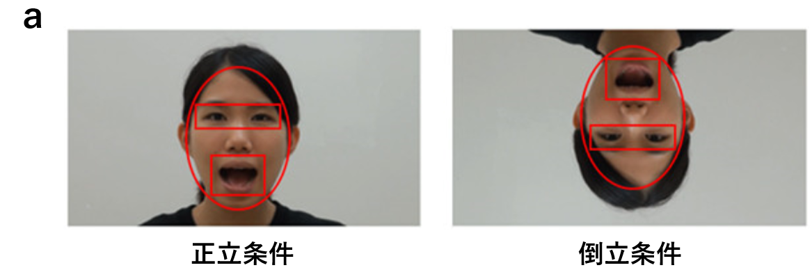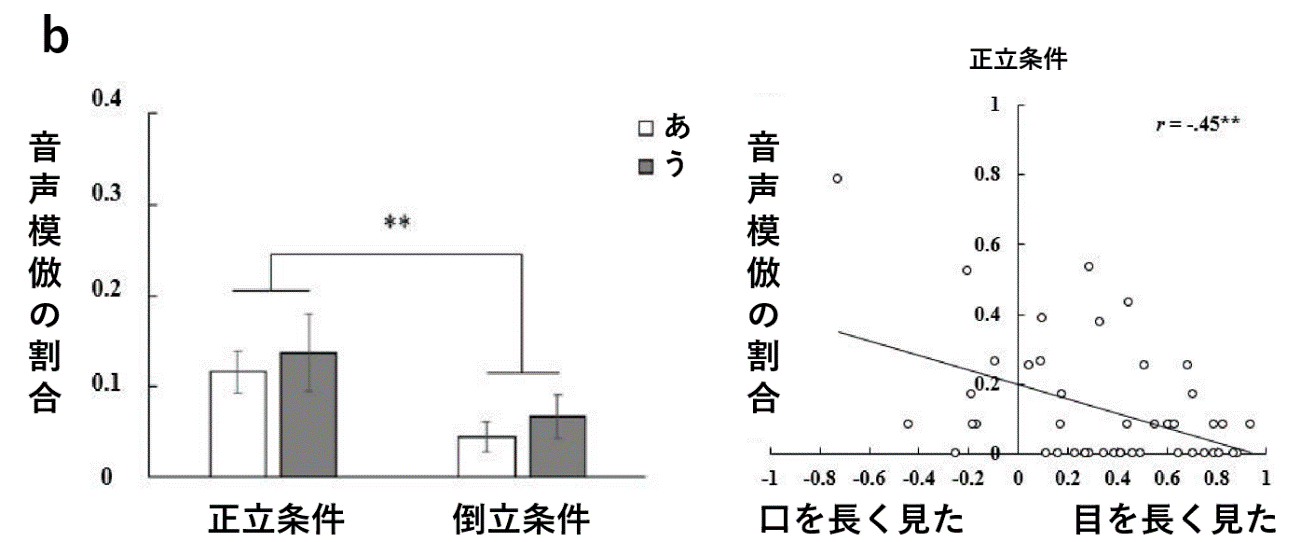 <実験1>では、生後6ヶ月児46名を対象に、母音(「あ」、「う」)を発する発話者の顔に対する視線反応と、音声模倣反応を記録しました。その際、(1)音声模倣時にどこを見ているか(知覚)、(2)実際にどの程度音声模倣を行うか(産出)の2点に着目しました。具体的には、発話者の通常の顔情報(正立条件)と、顔情報を利用することが難しい上下180°回転させた顔(倒立条件)の2種類のどちらかひとつの視覚刺激をモニター上に提示し、同時に発話音をスピーカーを通して聞かせました(図a)。その結果、倒立条件に比べて正立条件の視覚刺激を提示したときに、乳児は音声模倣を頻繁に行いました。さらに、正立条件においては、発話者の口唇部を長く注視した乳児ほど、音声模倣の頻度が高いことがわかりました(図b)