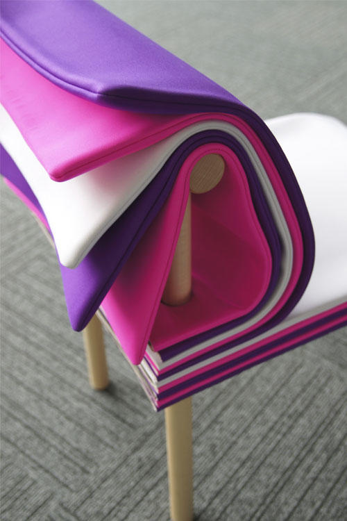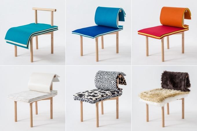 木のフレームと座面の上に、フェルト製のシートが何層にも分かれており、めくる度にさまざまな色と素材を楽しむことができる。めくることで高さの微妙な調整と同時に、座面のカラーをシンプルな動作で変えることができ、体にも心にもフィットする椅子になる。