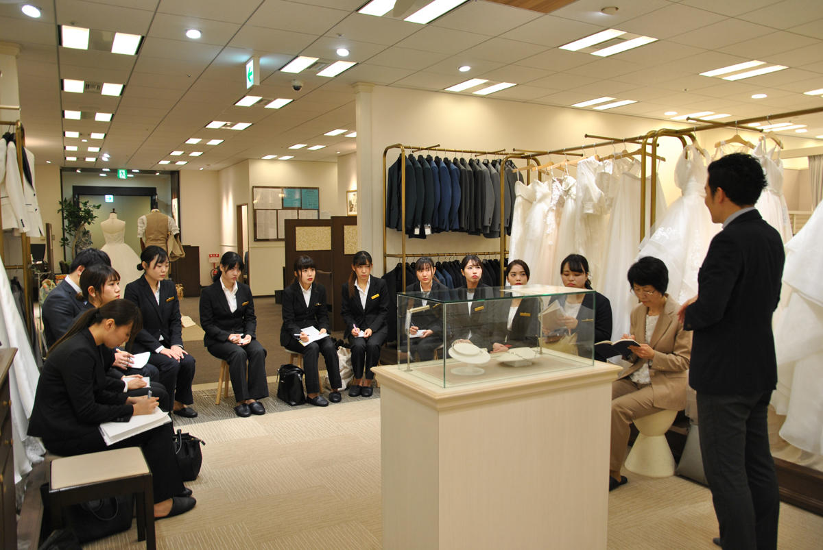 授業では初めに、結婚式の基礎知識やプロジェクトの担当ごとの役割について学習。現場研修では、国内外の挙式サービスや衣裳・写真事業を展開するワタベウェディングを訪問し、現場で働くプロから学んだ。さらに、グアムにも足を運び、本番同様の模擬挙式で実際の流れを学んだ。