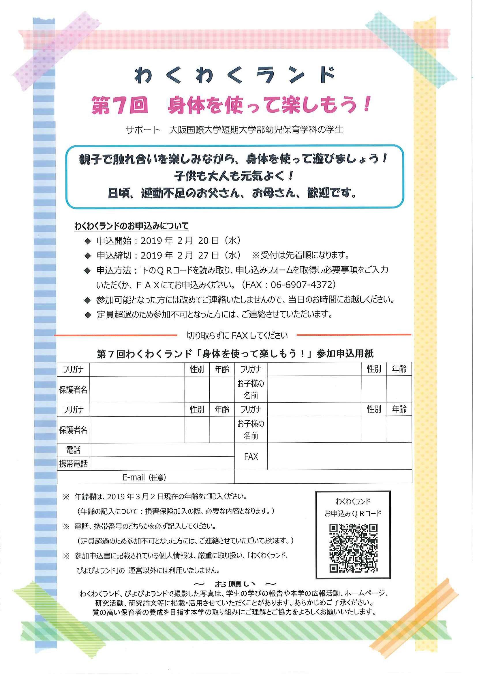 大阪国際大学短期大学部(大阪府守口市/学長:宮本郁夫)の幼児保育学科では、子育てを応援する場を広げる活動を企画し、地域のお子様と保護者の方に参加していただいています。その活動のひとつとして「わくわくランド」を定期的に開催しており、幼児保育学科教員の専門性を活かしたワークショップでは、保育者を目指すおねえちゃん先生・おにいちゃん先生たちがサポートします。今回の「わくわくランド」では、親子の触れ合いをテーマに子どもも大人も元気良く身体を使って遊んでいただきます。3月2日(土)10時から11時まで。場所は大阪国際大学内のフィットネスルーム。参加費無料。