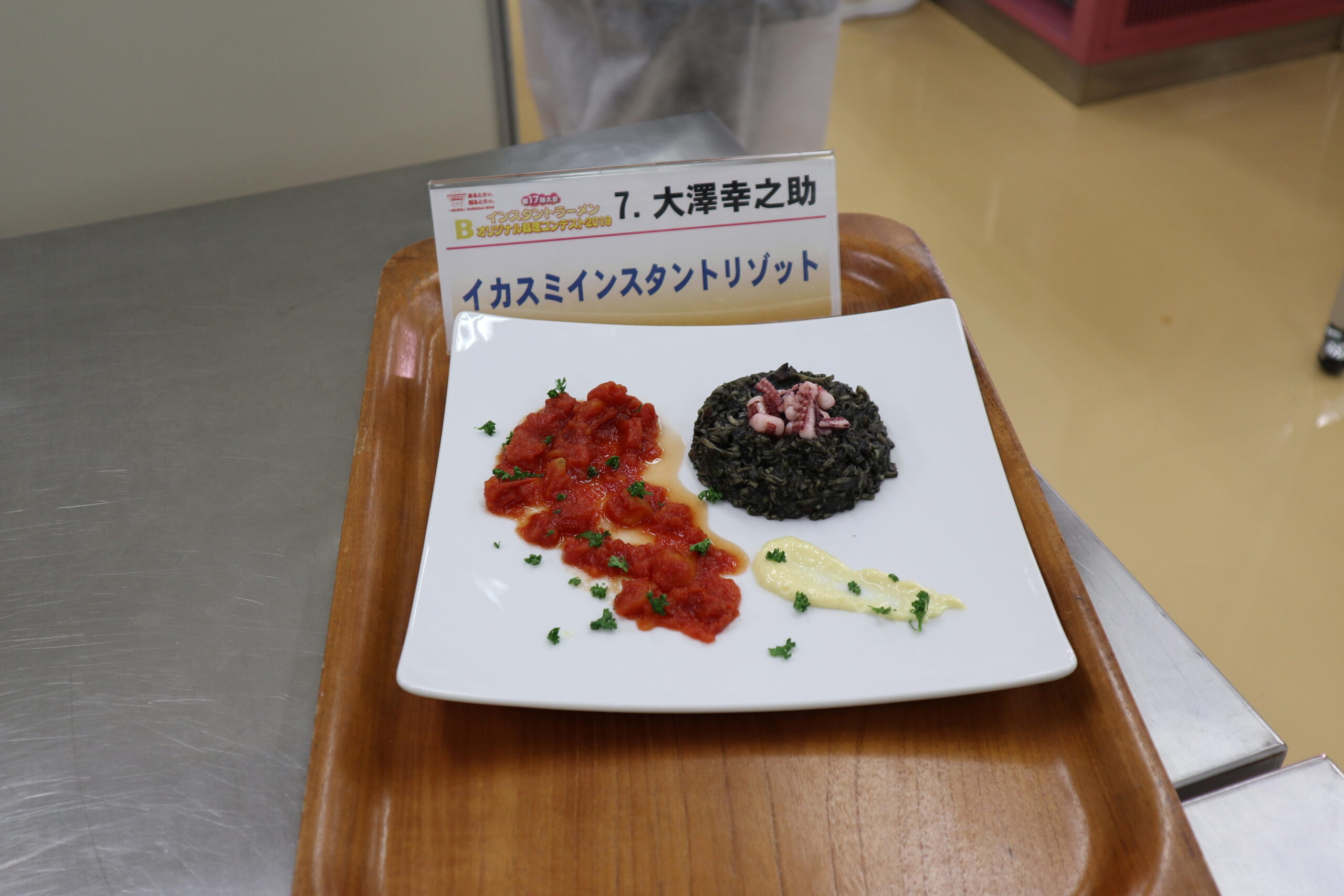 大澤さんの作品「イカスミインスタントリゾット」は、シーフード味のカップのインスタントラーメンを細かく砕いて、炒めたイカにイカスミソースなどを加えてリゾット風にした。これにトマト缶で作ったトマトソースとアイオリソースを付けた。インスタントラーメンのカップを型に使って盛り付ける工夫もした。