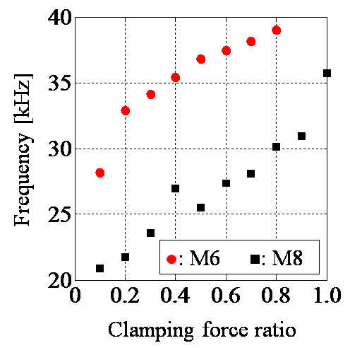 適正締め付けトルクで締結されている状態と緩んでいる状態において、それぞれ超音波レベルでの実験モード解析を行い、ボルト頭部の局所的な揺れ方を観察しました。ボルトを叩いて振動させた結果、適性に締まっていればボルト頭部の振動モード形の固有振動数が高く(細かく速く揺れる)、緩むことで低下(大きくゆっくり揺れる)することがわかりました。これにより、ボルト頭部の固有振動数を観察すれば、ボルト締結体の軸力の程度を検知することが実証されました。