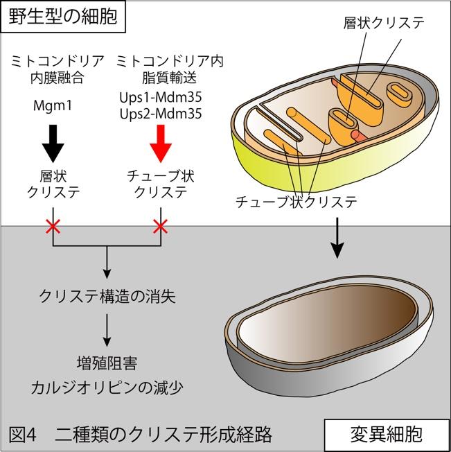 そこでミトコンドリア内のリン脂質輸送もクリステ構造に寄与するのではないかと仮説を立て、電子顕微鏡解析によりミトコンドリアの内膜構造を観察した。実験を行った結果、確かに、Mdm35を欠損した細胞ではクリステ構造の数が減少していた。さらにMdm35と同時にMgm1を欠損させた細胞ではクリステ構造が全く無い細胞が多く観察された。これらの結果は、ミトコンドリア内でのリン脂質輸送が、クリステ形成に関与すること示している。Mgm1による層状クリステ形成経路と、今回の研究によって明らかになったミトコンドリア内リン脂質輸送が関与するチューブ状クリステ形成経路の両方が阻害された場合、クリステ構造がほとんど形成されなくなったことを示しているのである(図4)。また、クリステ構造がほとんど形成されない状態では、ミトコンドリアの機能に重要なリン脂質であるカルジオリピンの量も激減することがわかった。