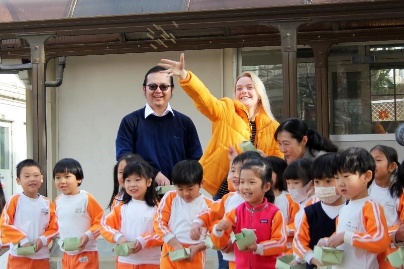 ◆関西大学外国人留学生と幼稚園児が一緒に豆まき◆~弱い心よ、さらば!強く優しい人に!節分を通して国際交流&日本文化理解を促進~