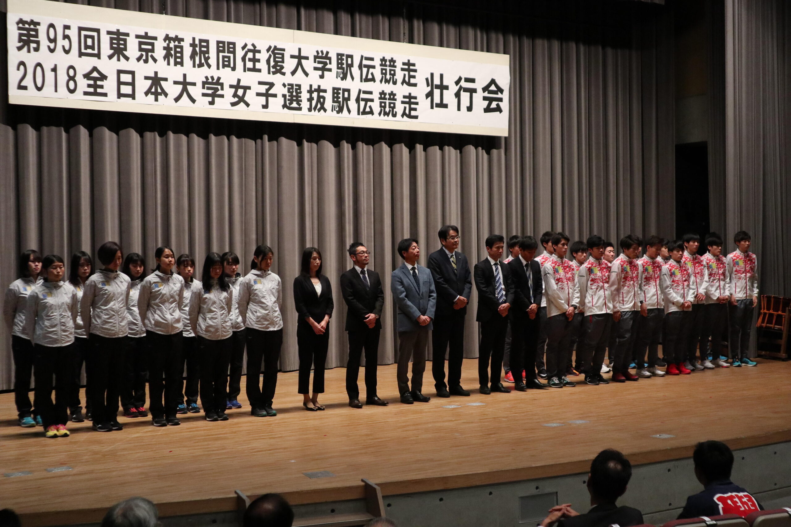 両駅伝部の壮行会は坂戸キャンパスの清光ホールで開催。ホールを埋めた約500人の学生や教職員の拍手に迎えられ、両部の部長、監督、コーチ、選手が入場した。