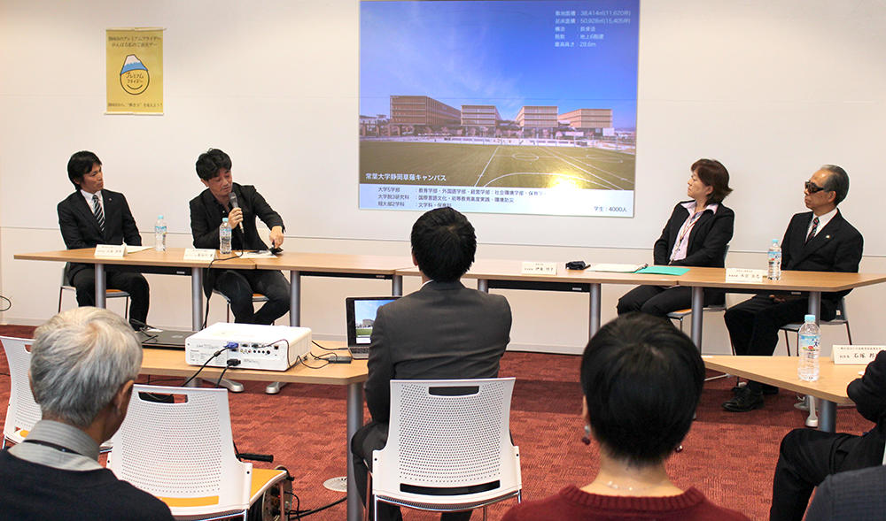 学校法人常葉大学 常務理事・法人事務局長 木宮岳志氏、 常葉大学教育学部心理教育学科長・学生部長 伊東明子教授、竹中工務店名古屋支店設計部 設計6グループ長 常葉大学静岡草薙キャンパス設計者 長谷川寛氏、一般社団法人草薙カルテッド共同代表・草薙商店会会長 山本洋平氏が登壇。常葉大学静岡草薙キャンパスの実現に取り組んだ竹中工務店担当者とキャンパスが位置する草薙地区の商店会会長を常葉大学に招き、学生と地域企業・地域市民の交流を生み出す新しいキャンパス設計の狙いと、草薙地区のまちづくりの展望を交えた静岡市における新しい時代の地域との交流デザインについて、市民公開型のクロストークを実施しました。