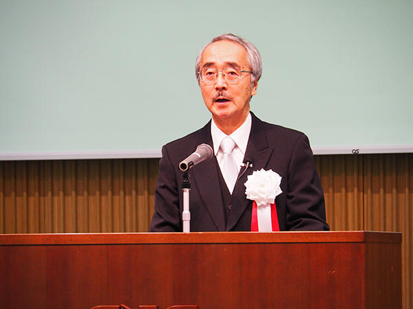 また、文部科学省高等教育局私学部長の白間竜一郎氏、千葉県知事の森田健作氏(ビデオメッセージ)、市川市長の村越祐民氏、日本私立大学協会副会長の福井直敬氏、千葉商科大学前学長であり公立大学法人首都大学東京理事長の島田晴雄氏から祝辞が述べられた。