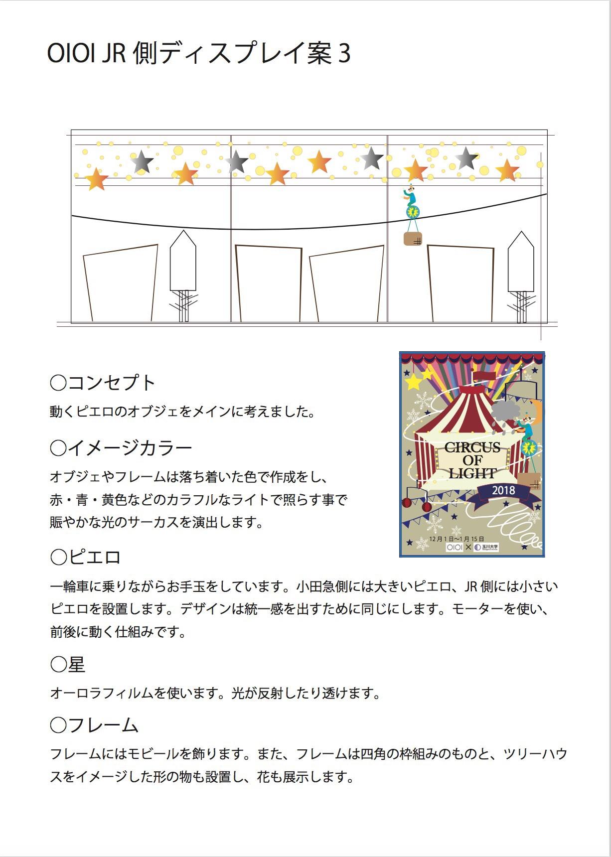 ディスプレイデザインのコンセプト”サーカス”のピエロをメインオブジェとして考えました。ピエロは一輪車に乗りながらお手玉をしているモチーフで、モーターを使い前後に動く仕組みを取り入れました。小田急線側のショーウィンドウには大きいピエロ、JR線側には小さいピエロを配置します。ツリーハウスをイメージし、木で制作したフレームにはモビールや町田マルイ店内の商品を展示します。オブジェやフレームは落ち着いた色で形成し、カラフルな赤・青・黄色などのライトで照らすことで、賑やかな光のサーカスを演出します。