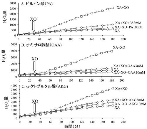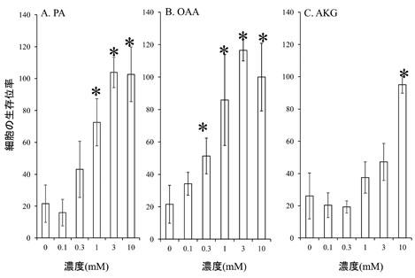 キサンチン(XA)とキサンチンオキシダーゼ(XO)を用いてスーパーオキシドを発生させ、これが細胞内の酵素スーパーオキシドディスムターゼ(SOD)によって変換される過酸化水素(H2O2)(注6)を、蛍光色素で定量し、その蓄積を観察しました。この結果、ミトコンドリアが産生する主な有機酸のうち、ピルビン酸、オキサロ酢酸、α-ケトグルタル酸の3種は、H2O2量の増加を有意に抑制した(図2)一方、他の6種(乳酸、クエン酸、イソクエン酸、コハク酸、フマル酸、リンゴ酸)にはこの作用はありませんでした。また同3種は細胞死を有意に抑制した(図3)一方、他の6種は全く抑制しませんでした。
