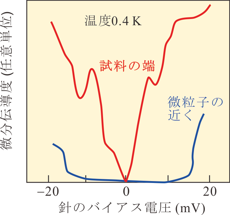 更に低温走査プローブ顕微鏡(注8)を用いて、トポロジカル絶縁体状態で局所状態密度を測定した結果が図2です。ゲート電圧が抵抗ピーク位置(トポロジカル絶縁体状態)以外では、状態密度にはギャップが現れません。トポロジカル絶縁体状態では、図2の「微粒子近傍」と書かれた測定結果のように、特にスピン軌道相互作用が強い微粒子の周りで微分伝導度がゼロの領域すなわちエネルギーギャップが広がります。しかし、試料端付近では赤いラインで示したように、このエネルギーギャップがつぶれてぎりぎり金属的な状態が現れていることがわかります。これが電気伝導に現れたヘリカルエッジ状態に対応しています。