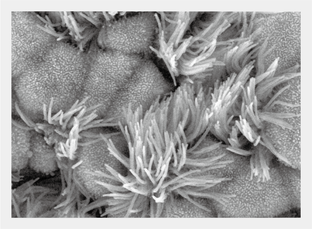 気管繊毛のはたらきによって、私たちの肺の中は ”無菌” に保たれていることが知られています。この繊毛とは、細胞から突き出た長さが1ミリの100分の1ほどの毛のような構造で、無数の繊毛が気管の細胞表面をおおっています (図2参照)。そして、1本1本の繊毛は「自律的に動く」ことができるのです。この動きによって気管表面に粘液層の流れが生み出され、呼吸とともに入り込んできた体に有害な塵や病原菌といった異物を肺からのどへ向けて押し出すことにより、私たちの肺の中が清浄に保たれています。