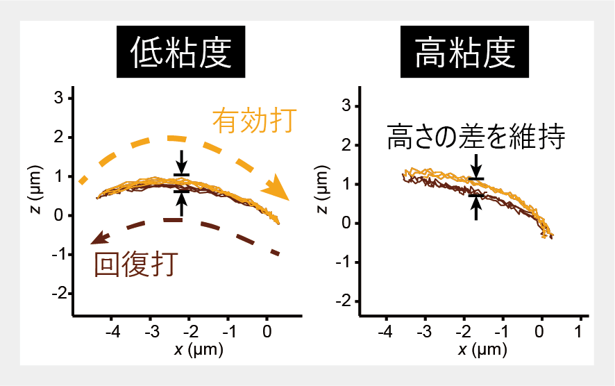 研究グループは、さらに気管表面のような粘度の高い環境で、繊毛がどのような運動を行うかを調べるために、繊毛のまわりを粘度が高い流体でみたした状態にして、同様の測定を行いました。