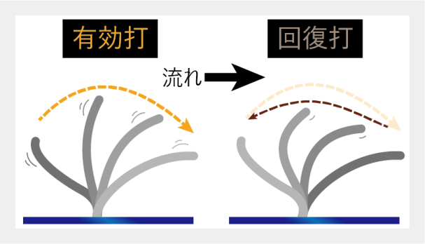 では、この粘液層の流れはどのように生み出されるのでしょうか。繊毛は、速く高い位置を ”かく” ことにより粘液を押し出す「有効打」と、ゆっくりと低い位置を曲がりながら元の形状に戻る「回復打」を、1秒間に約10回の周期で繰り返すことにより流れを生み出します (図3参照)。