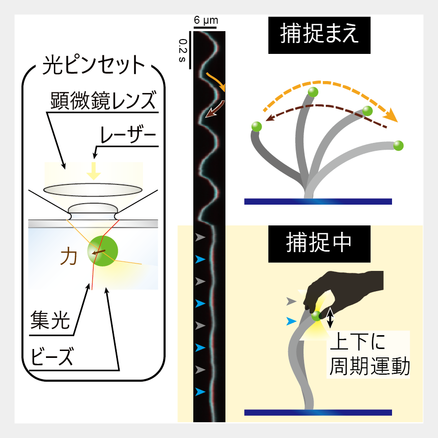 博士後期課程3年の加藤孝信さんは、西坂研究室で独自に開発した顕微鏡を用いて、繊毛たった「1本」の動きを高精度・高速度で撮影することに成功しました。加えて、本年のノーベル物理学賞の対象となった光ピンセットという技術で「繊毛の先端を捕捉」し、人為的な負荷を与えても繊毛が周期的に動き続けることを可視化しました (図1参照)。