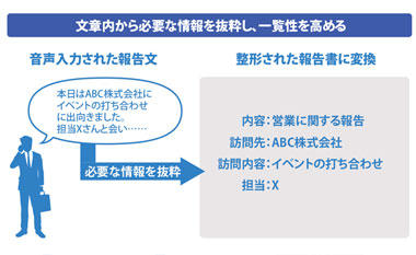 株式会社ビズオーシャン(東京都中央区)との共同開発。音声入力されたデータから必要な部分を抜粋・要約し、定型の報告書に整形する仕組みを、同社の業務支援AIソフト「SPALO(スパロ)」にて2019年に実用化予定。