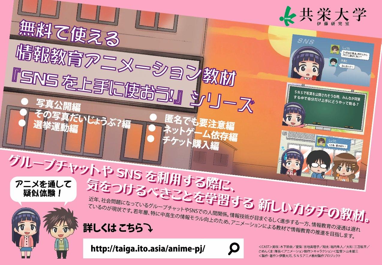 伊藤専任講師はこれまでもアニ玉祭に参加しており、今回の出展では開発したアニメーション教材『SNSを上手に使おう!』シリーズの「写真公開編」「その写真だいじょうぶ?編」「選挙運動編」「匿名でも要注意編」「ネットゲーム依存編」「チケット購入編」の6本のほか、インターネット選挙運動に関するインタラクティブゲーム教材も公開する。