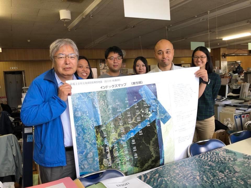 地震直後に同社が撮影した衛星画像を入手して被災地区の解析を進め、その結果をA0判31枚とA3判250枚に印刷。9月11日に自ら厚真町役場に届けた。その後、14日、23日にも同町や安平町を訪ね、新たに作製した詳細な地図を手渡した。