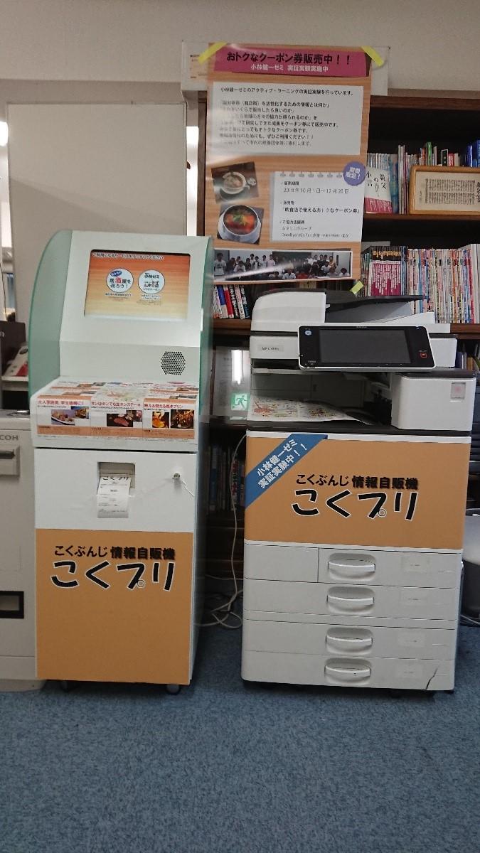 情報自販機「こくプリ」は、国分寺市内の商店の中でも割合の高い居酒屋やラーメン店を活性化し、街全体の活性化に繋げようという目的のもと設置される。小林ゼミでは、2017年度から情報自販機を設置するため「国分寺市を活性化する情報とは何か」をテーマに調査、検討してきました。今年度は、国分寺市内の商店25店ほどに直接足を運び交渉し2年がかりでクーポンの販売にこぎつけた。