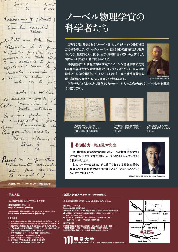 10月といえば、ノーベル賞受賞者の発表が予定されており、毎年関連した話題の多い時期でもあります。明星大学では数々の貴重書を保有しておりますが、ノーベル物理学賞受賞者の貴重な資料も所蔵しており、今回は、ベクレル、キュリー夫人、アインシュタインの貴重な資料を公開し、どのように研究を行ったのか、本人の息吹が伝わるような資料の展示を予定しています。併せて、現在もご活躍で、2015年にノーベル物理学賞を受賞された梶田隆章東京大学教授にも、貴重な資料をご提供いただき、その研究内容をご紹介できる運びとなりました。