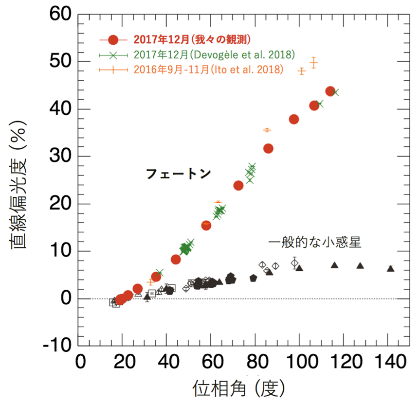 新中研究員らは、2017年に実施した観測の結果から、小惑星フェートンの表面は、他の普通の小惑星とは大きく異なっており、非常に高い偏光度を示すことを明らかにした。このことにより、小惑星フェートンの表面は、比較的大きなダスト粒子で覆われている、あるいは他の小惑星に比べて特異な反射特性を持つ可能性がある。先行研究でも限られたデータながら2016年にこうした高い偏光度が報告されているが、今回の緻密な観測によって、その結果をはっきりと確認することが出来た。また、これまでに観測されていない小さい位相角での偏光度も得られており(図2)、他の研究グループによって観測された結果と合わせて、小惑星フェートンの表面に反射特性のムラがある様子を示した。