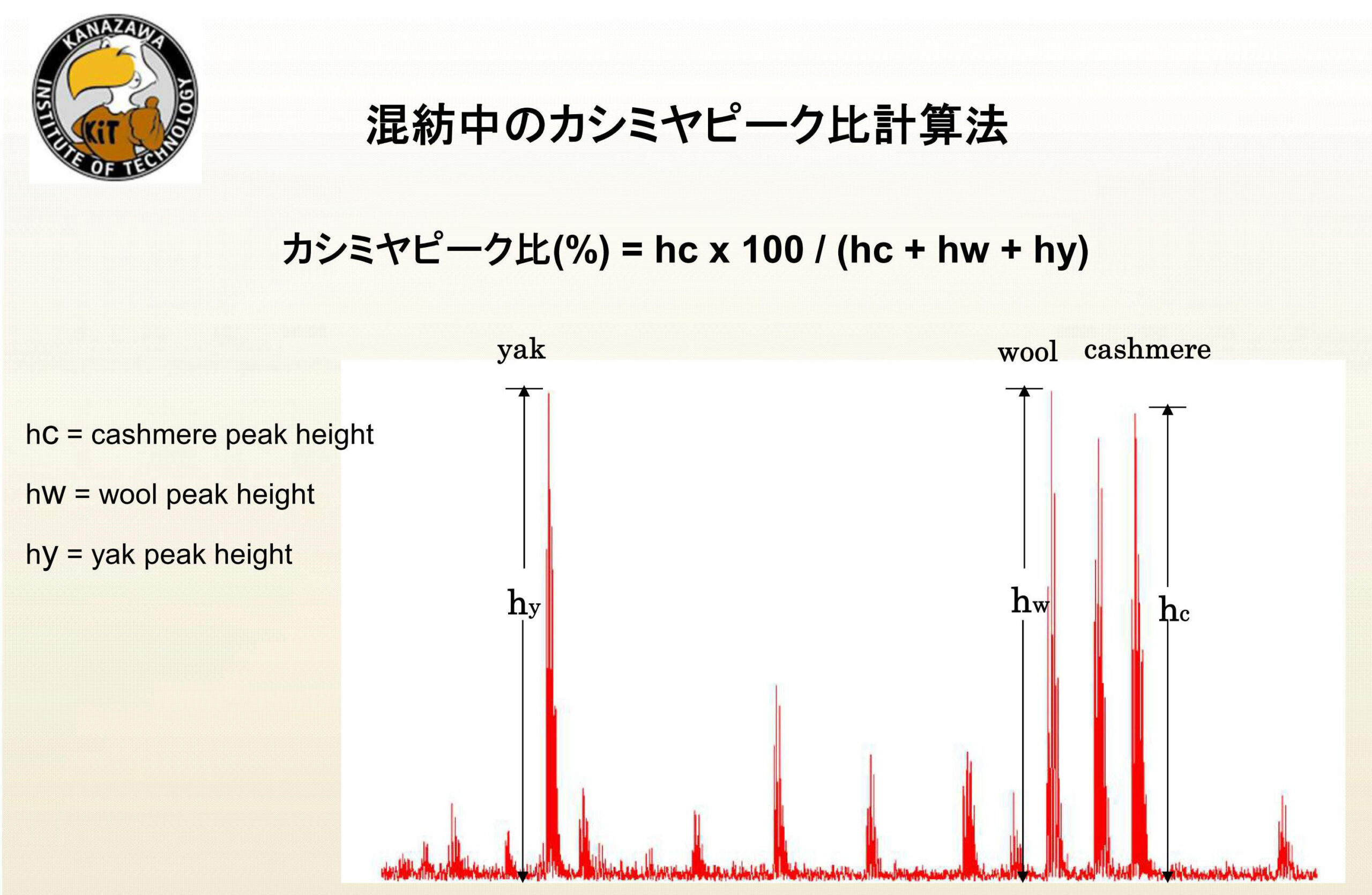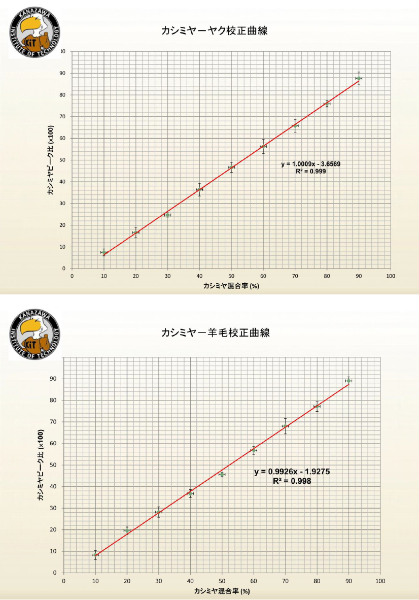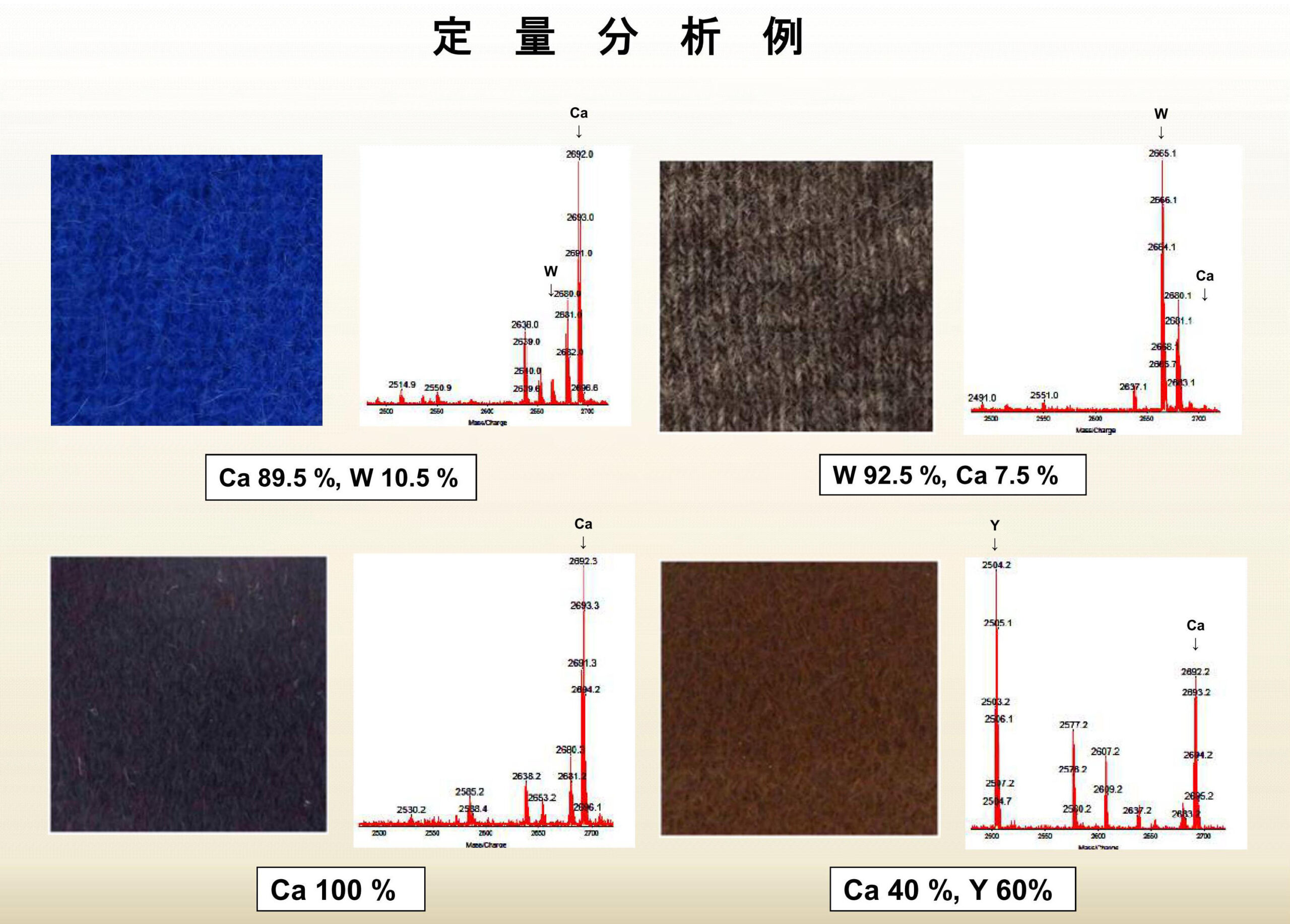 定性的な分析はもちろん、定量的にもかなりの精度で混用率が測定できるため、カシミヤ・キャメルヘア工業会からも早期の実用化が期待されています。