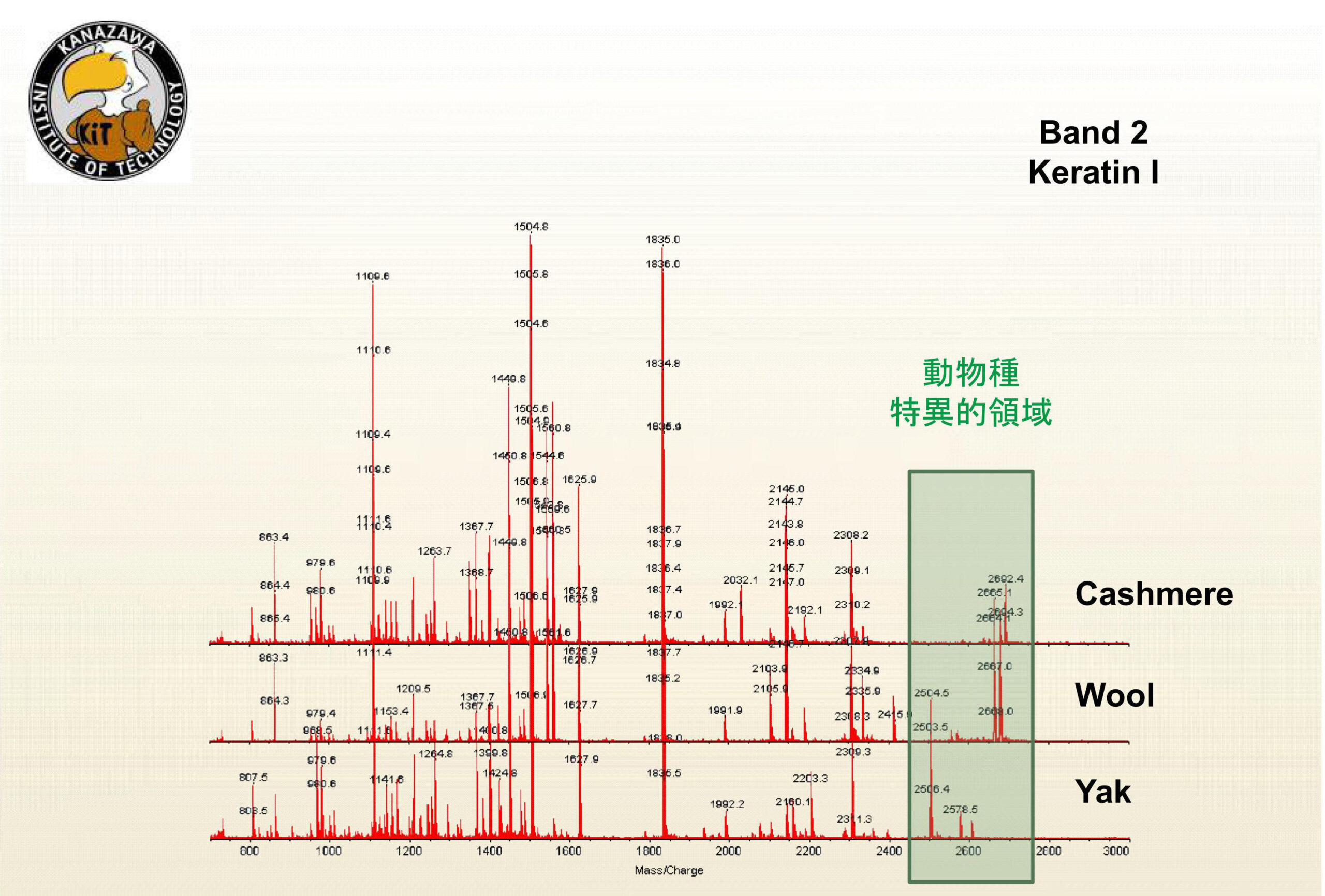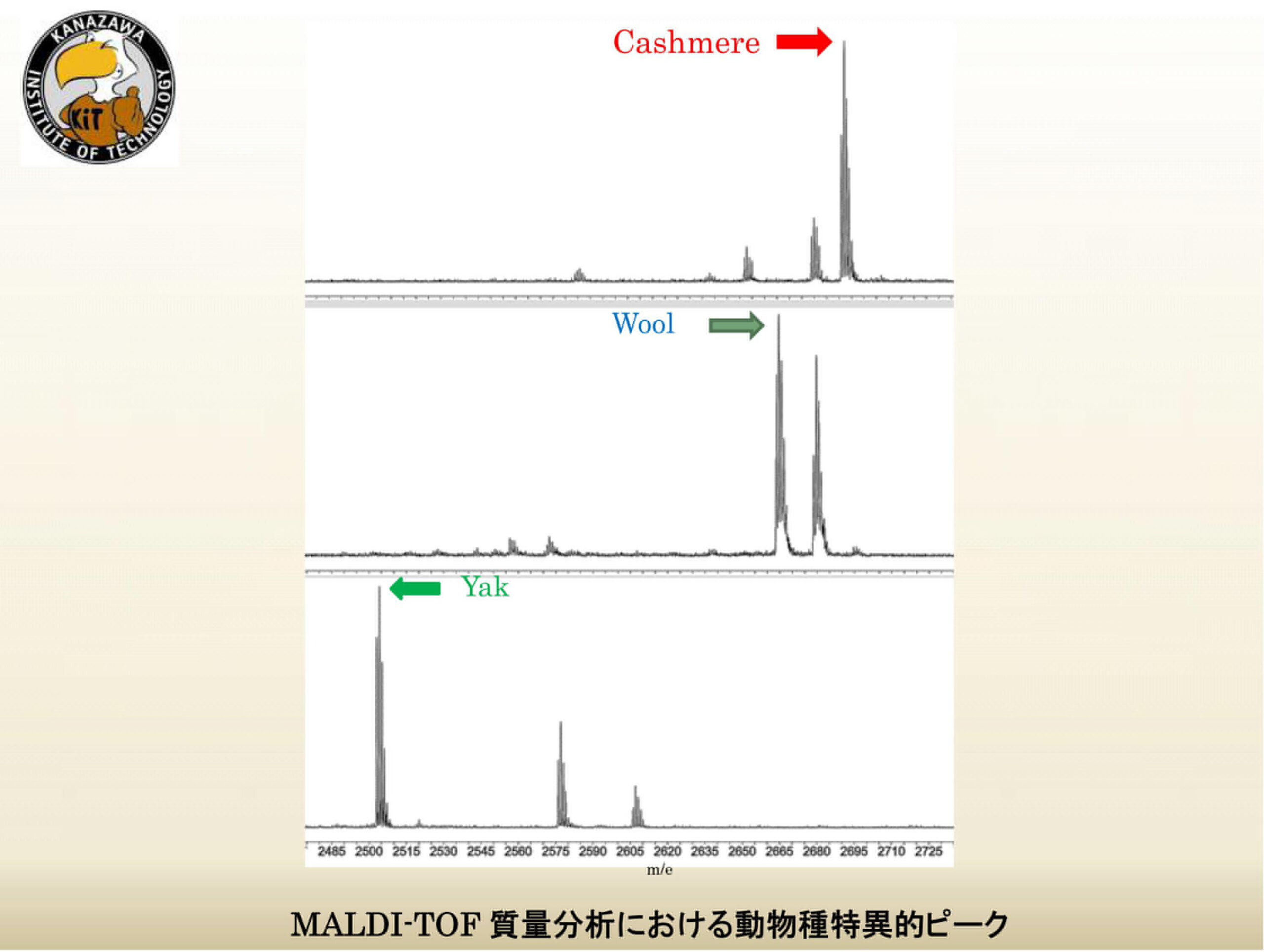 こうした状況の中で、金沢工業大学ゲノム生物工学研究所ではそれまで麹菌などの微生物の解析で培ったタンパク質解析技術を応用して、MALDI-TOF MS(マトリックス支援レーザー脱離イオン化-飛行時間型質量分析法)を利用した獣毛分析技術を開発し、2014年11月に発表しました。