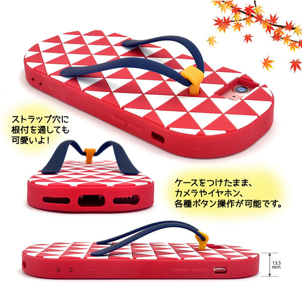和の心をスマホケースにしてみました。柄は、三角形を上下左右に並べた鱗文様。女性には厄除けの効果があるとされる模様です。立体化された鼻緒は指を通すことができるため、しっかりとスマホを持つことができます。色は青・赤・黄の3色を用意し、男性でも女性でもお使いいただけます。