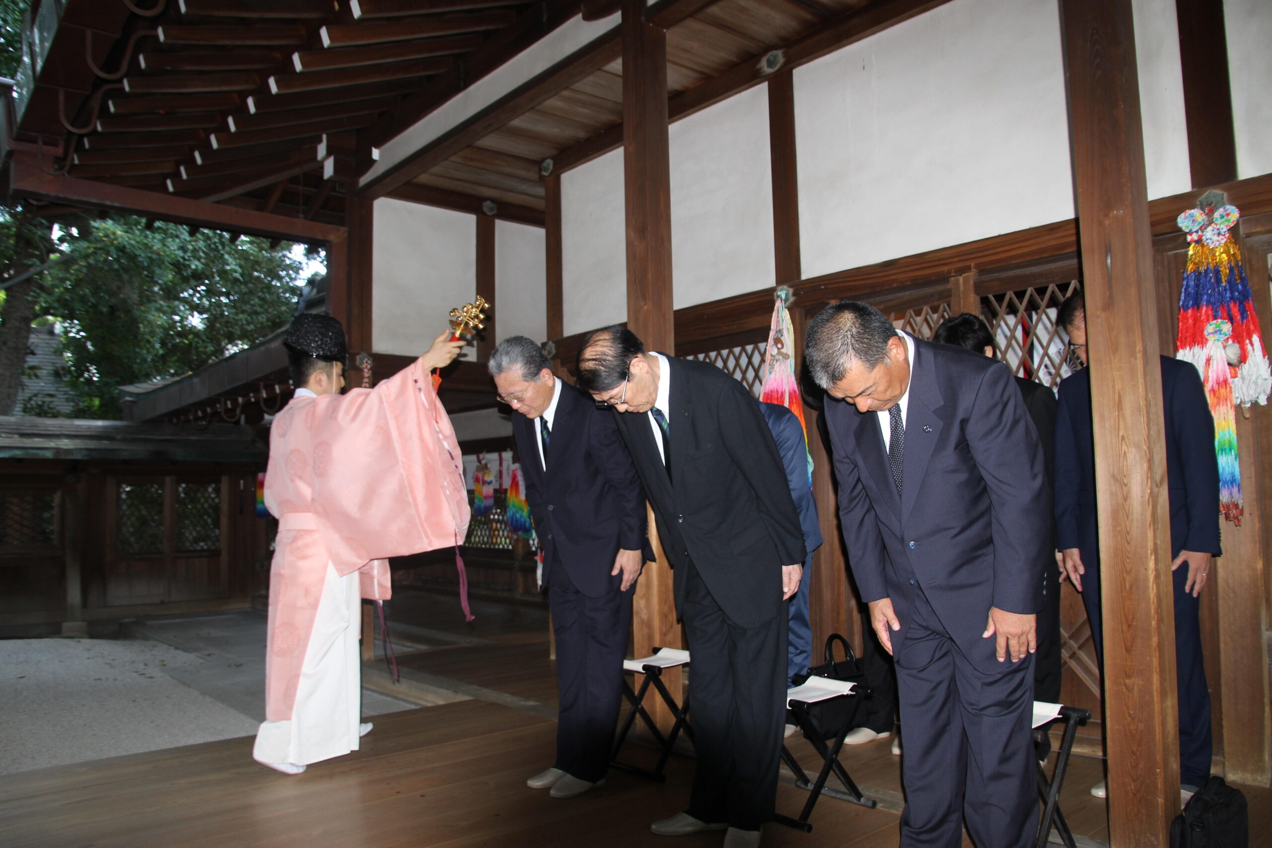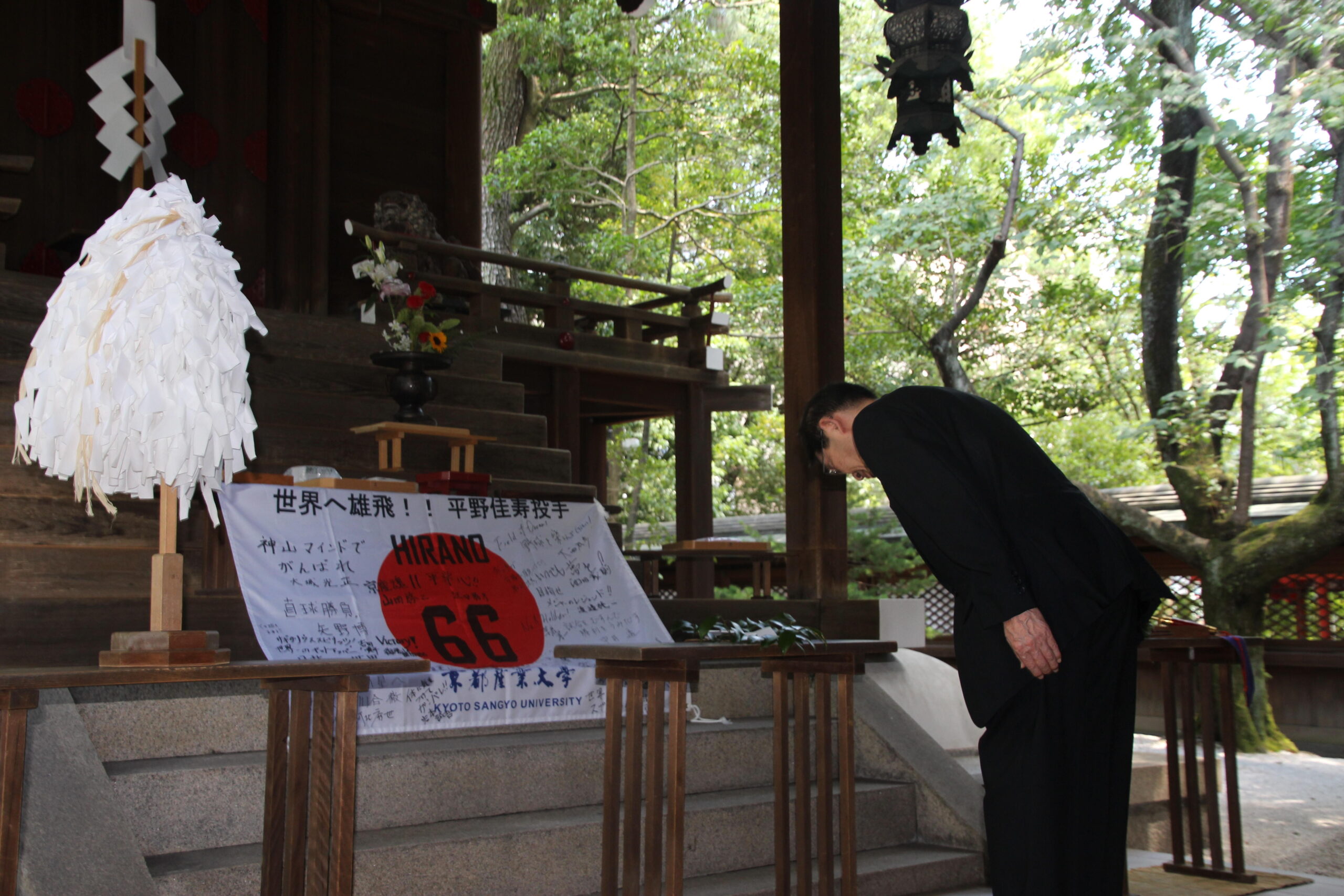 メジャーリーガーの平野佳寿選手(2006年経営学部卒)の活躍を祈願し、大城光正学長らがスポーツの守護神として知られる白峯神宮を参拝 — 京都産業大学