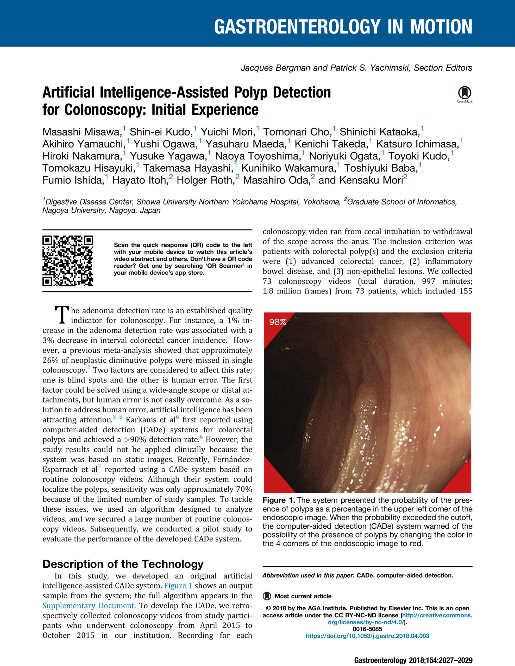 この人工知能は昭和大学横浜市北部病院で撮影された大腸内視鏡(オリンパス株式会社の内視鏡を使用)の動画約20万フレームを学習し、学習していない50病変の動画でテストしたところ94%の病変が人工知能で検知できた。本研究では静止画ではなく、動画で検証することで、実際の臨床に近い厳格な環境で評価していることが特長である。この研究結果は昭和大学横浜市北部病院の三澤将史講師がまとめ、米国消化器病学会雑誌であるGastroenterology誌(論文の影響力を示すインパクトファクターが20.773)の2018年6月号に掲載された。大腸内視鏡のAIを用いた自動検出論文は、これまで情報科学専門家からの報告しかなく、医師が報告した論文としては世界初である。