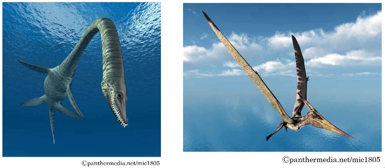 現在の地球上には、哺乳類を食物連鎖の頂点とした生態系が広がっているが、今から約2.5億年前~6600万年前の中生代に地球上で繁栄していたのは、哺乳類ではなく爬虫類だった。中生代の爬虫類といえば、代表的なものは恐竜である。恐竜はワニに近い爬虫類から進化した動物で、基本的に陸上で生活していた。中生代には恐竜以外にも、空を飛ぶ爬虫類である翼竜や水中を泳ぐ爬虫類である首長竜、魚竜(※7)、モササウルス類(※8)などが繁栄していた。