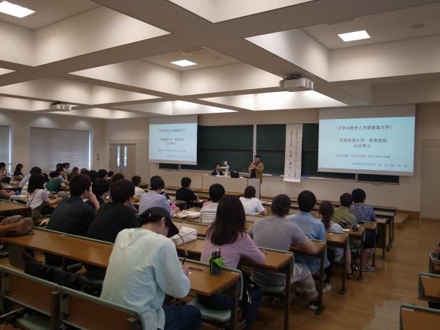 京都産業大学の自校教育の科目「大学の歴史と京都産業大学」を開講。学長をはじめ、大学を構成する部局の責任者や専門研究者、京都産業大学に縁のある学内外の有識者が登壇し、内外から多角的に熱く「京都産業大学論」を語る。