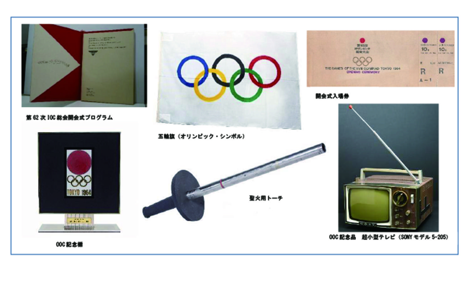 本学の元学長・元文相の愛知揆一は、オリンピック実施に密接に関わる文部省の長として、財団法人オリンピック組織委員会の理事を務めました。愛知元学長の所蔵資料を引き継いだ本学史料室では、聖火用トーチ、五輪旗、組織員会記念のプレートがつくソニーの超小型テレビ、組織委員IDカード、同識章バッヂ、同記念アルバム、組織委員会用の開閉会式実施要領、国際オリンピック委員会総会開会式プログラムなど、ほかではあまり目にすることができない資料を保存しています。