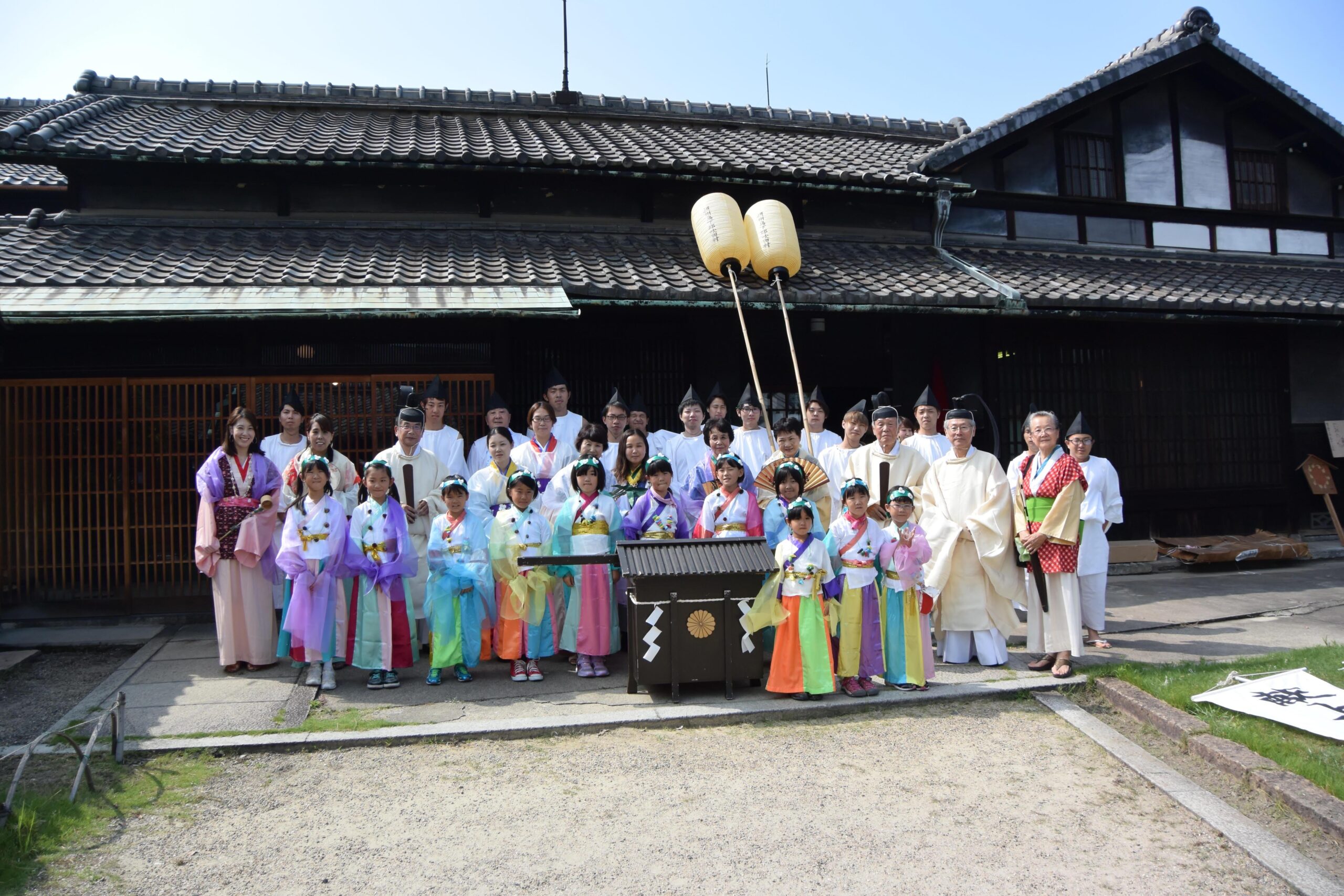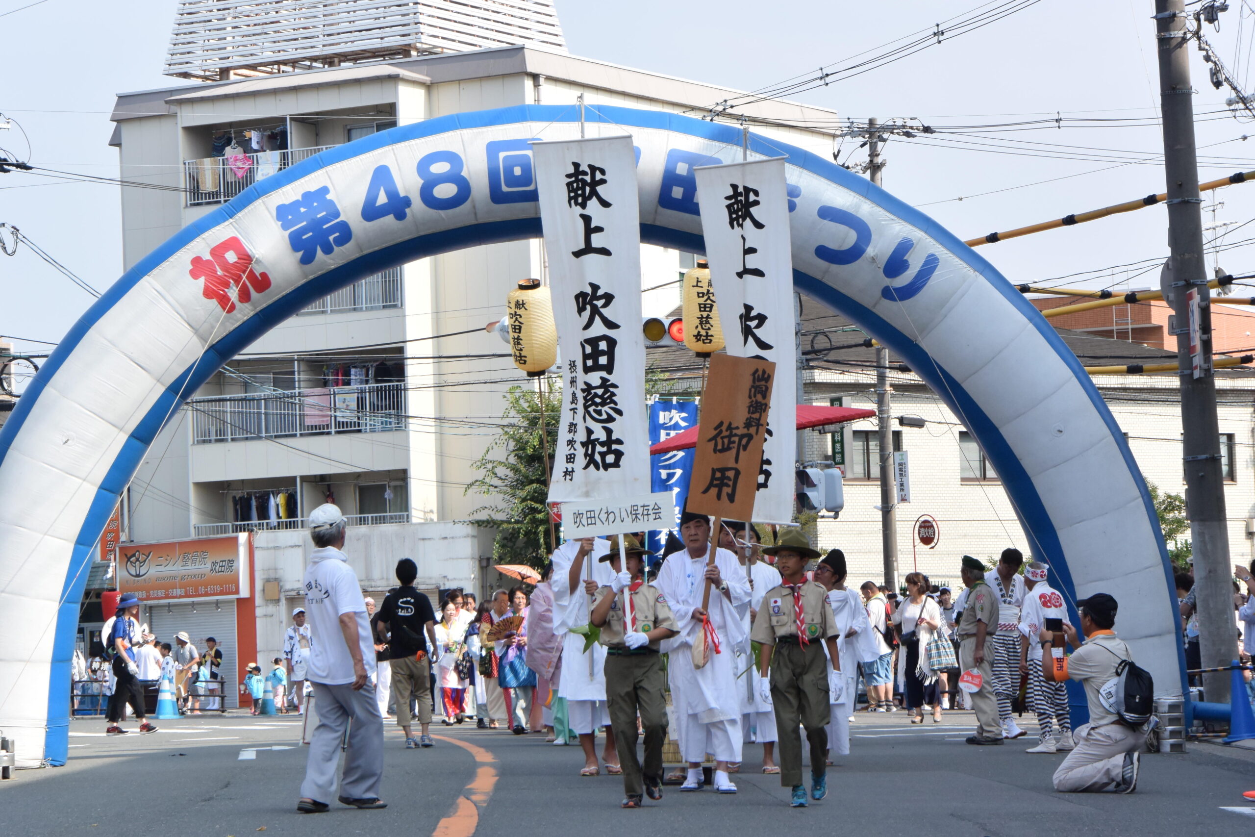 第49回吹田まつりの本祭りにおいて、本学学生が白装束に身を包み、吹田くわい献上籠、献上傘、幟および大提灯の持ち手などを担当し、高濱神社前から吹田くわい保存会の方々と行列を組み、後藤圭二 吹田市長に吹田くわいを献上します。