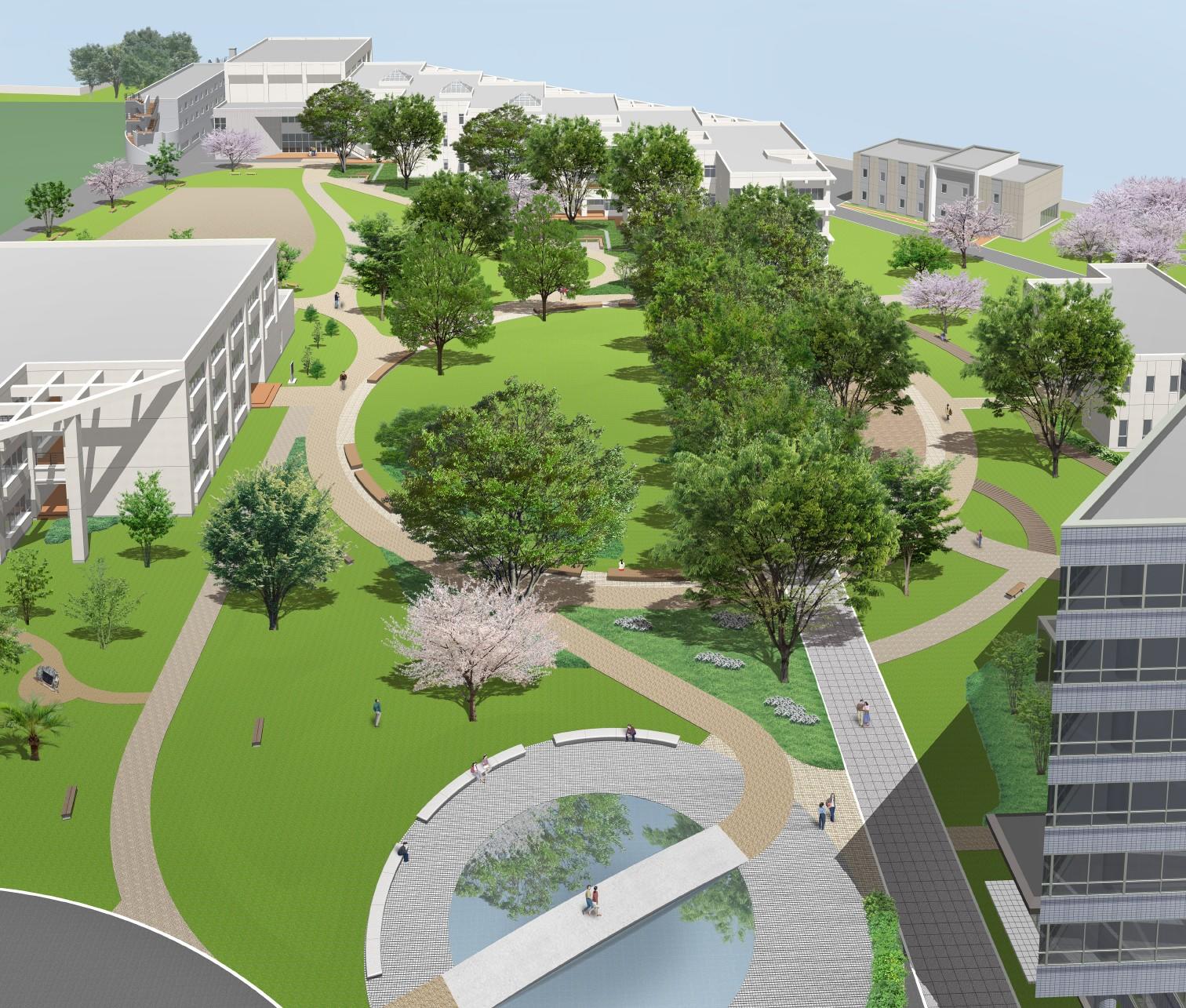 ・既存資産である大きな緑地帯とケヤキ並木をいかして、キャンパスの中心に緑の広場をつくり、学生・教職員などの交流の場・多様な活動の機会の拡大に配慮する。