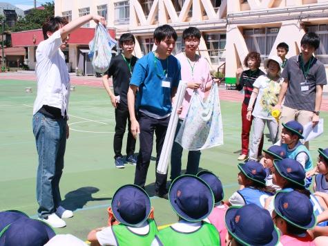 6月29日には、墨田区北部地域在住の子どもと防災意識啓発・交流を進めるため「防災観光ふろしき」を使った特別授業を第一寺島小学校で開催し、防災教育のモデルケースとしての活動を開始しました。授業では超撥水性を活かしてバケツに水を運ぶリレーや、防災に関するクイズも行うなど防災に関する知識を深めました。