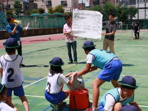 防災の知識を子どもの頃から定着させたい。その思いに共感した東京都墨田区立 第一寺島小学校 近藤 幸弘校長の協力の下、同校で特別授業を開催しました。約60人の児童が晴天の下、元気な声を上げながら「防災観光ふろしき」で水をくんでリレーを行いました。リレーの合間には、防災関連のクイズで得点を競うゲーム感覚を取り入れ、子どもたちに防災に関する正しい知識を楽しく知ってもらう機会にもなりました。