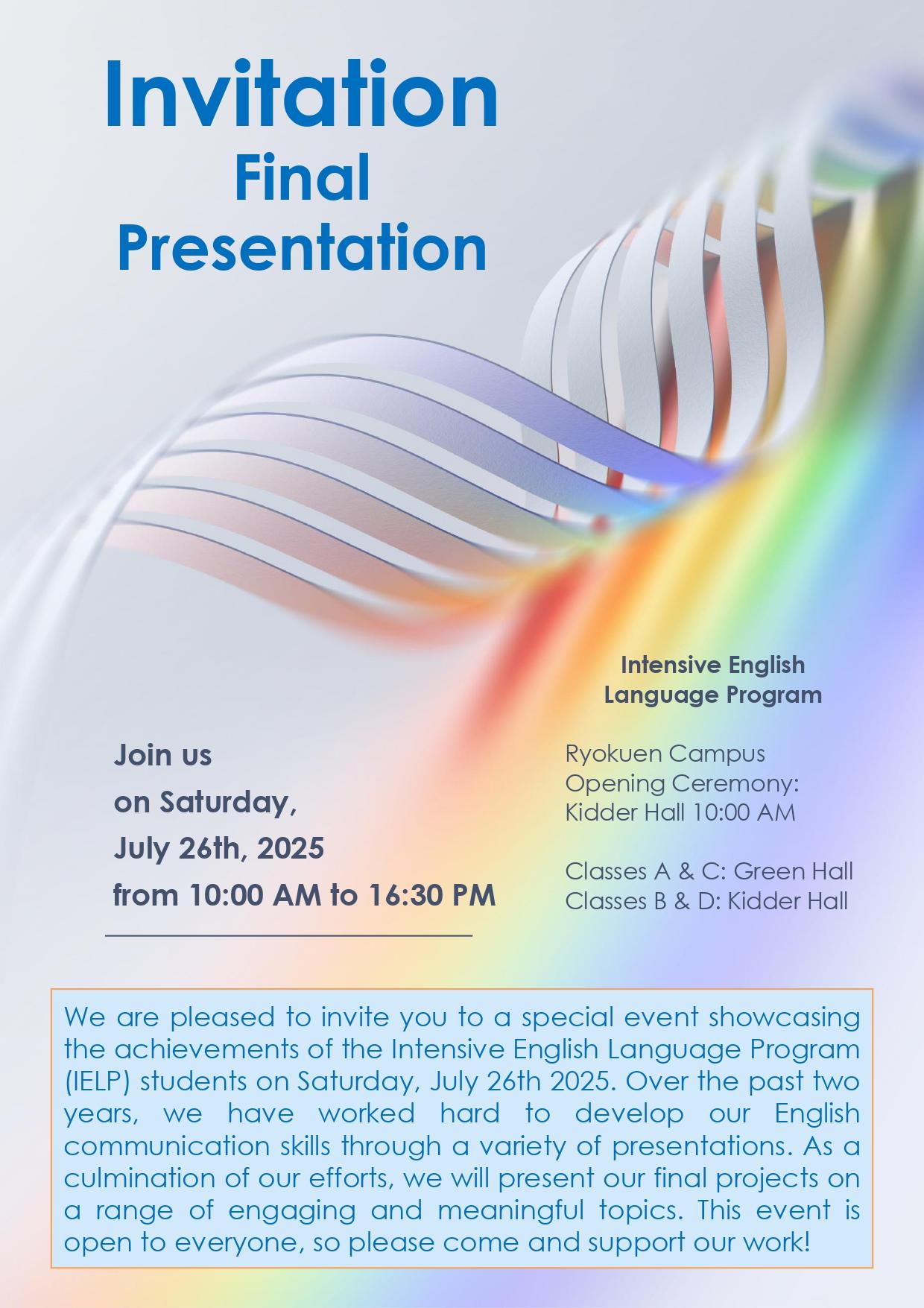 フェリス女学院大学(神奈川県横浜市/学長:小檜山ルイ)の英語教育運営委員会では、英語インテンシブ・コース履修学生による成果発表会Intensive English Language Program Final Presentationを7月26日(土)に開催します。
