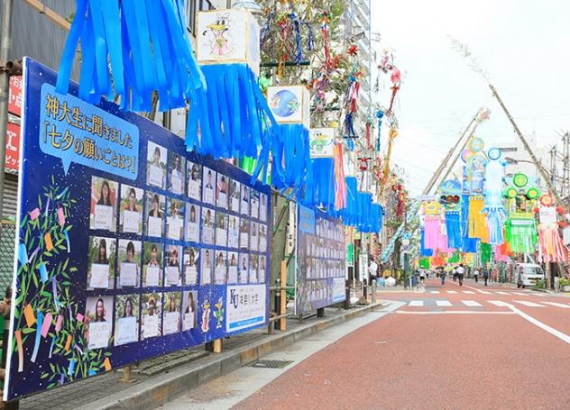 ●千人パレードを踊る東海道本通り(湘南スターモール)のゴール地点に、本学学生64名の「七夕に掛ける願いごと」を込めた、全長12メートルのPRボードを掲出。