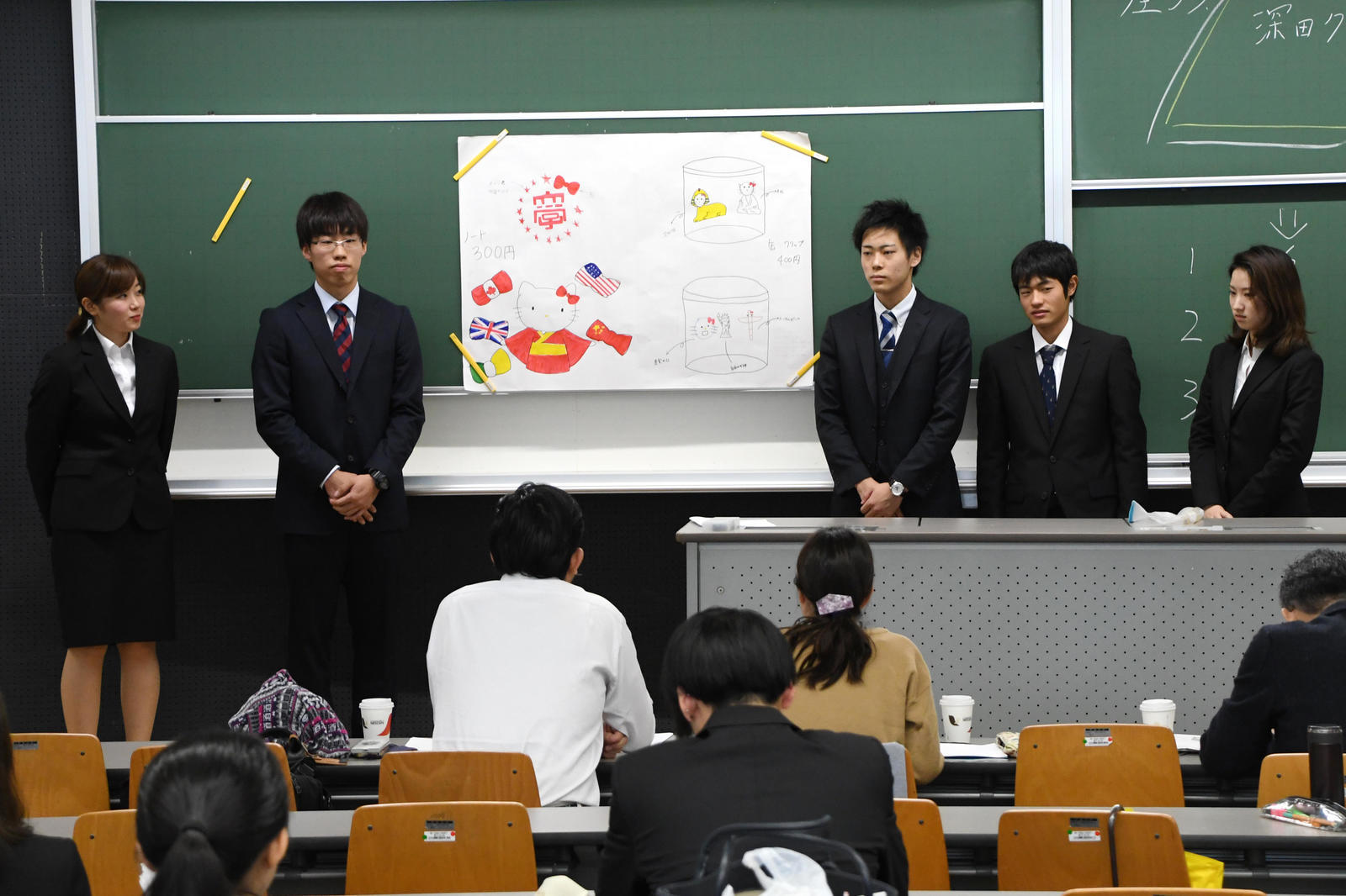 授業は、多摩地域のテーマパーク「サンリオピューロランド」で、キャラクター開発の背景やコンセプトをヒアリングすることから始め、チームごとに企画を練って、あすなろ舎にプレゼンテーションを行いました。最終的に選ばれた企画の中から、企業の承認を得て6つの企画が商品化されました。