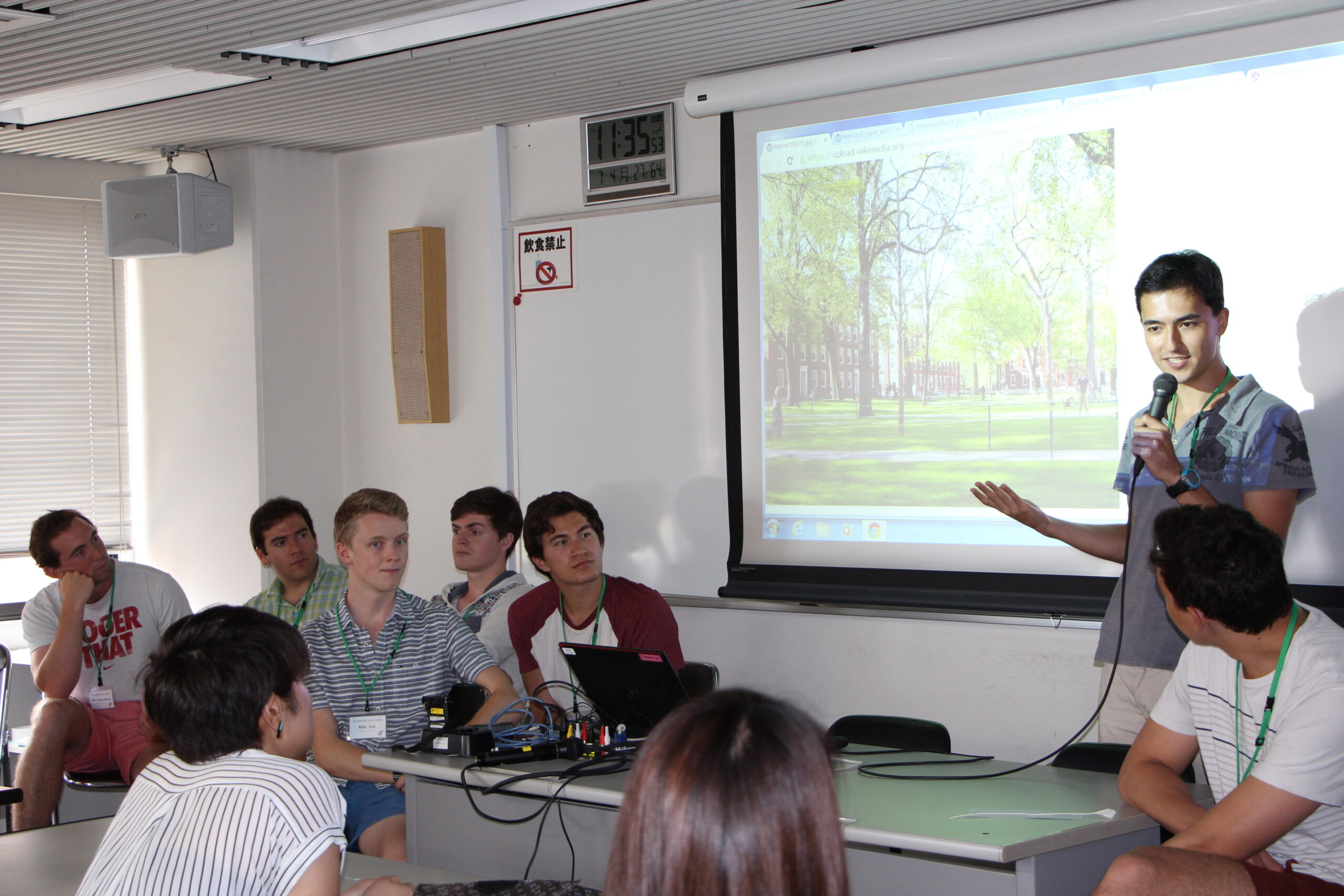 学生交流授業では「使える英語の実践」を目指してトークディスカッションを実施。「Harvard University Life」や「Unforgettable or Interesting Experiences while touring with Din & Tonics」をテーマとした討論を行う。異文化間コミュニケーションの実践と能力の向上が期待されるほか、ハーバード大学の雰囲気や学生の気質などを知る機会となる。