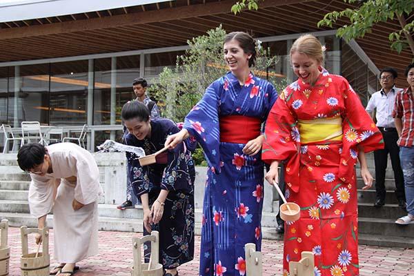 ・全学的に行うSDGsに対する取り組み「打ち水で涼しく大作戦」に海外学生たちが浴衣を着て参加。日本で夏を涼しく過ごすための伝統的な手法の効果を体感することにより、環境問題を考えるきっかけとする。