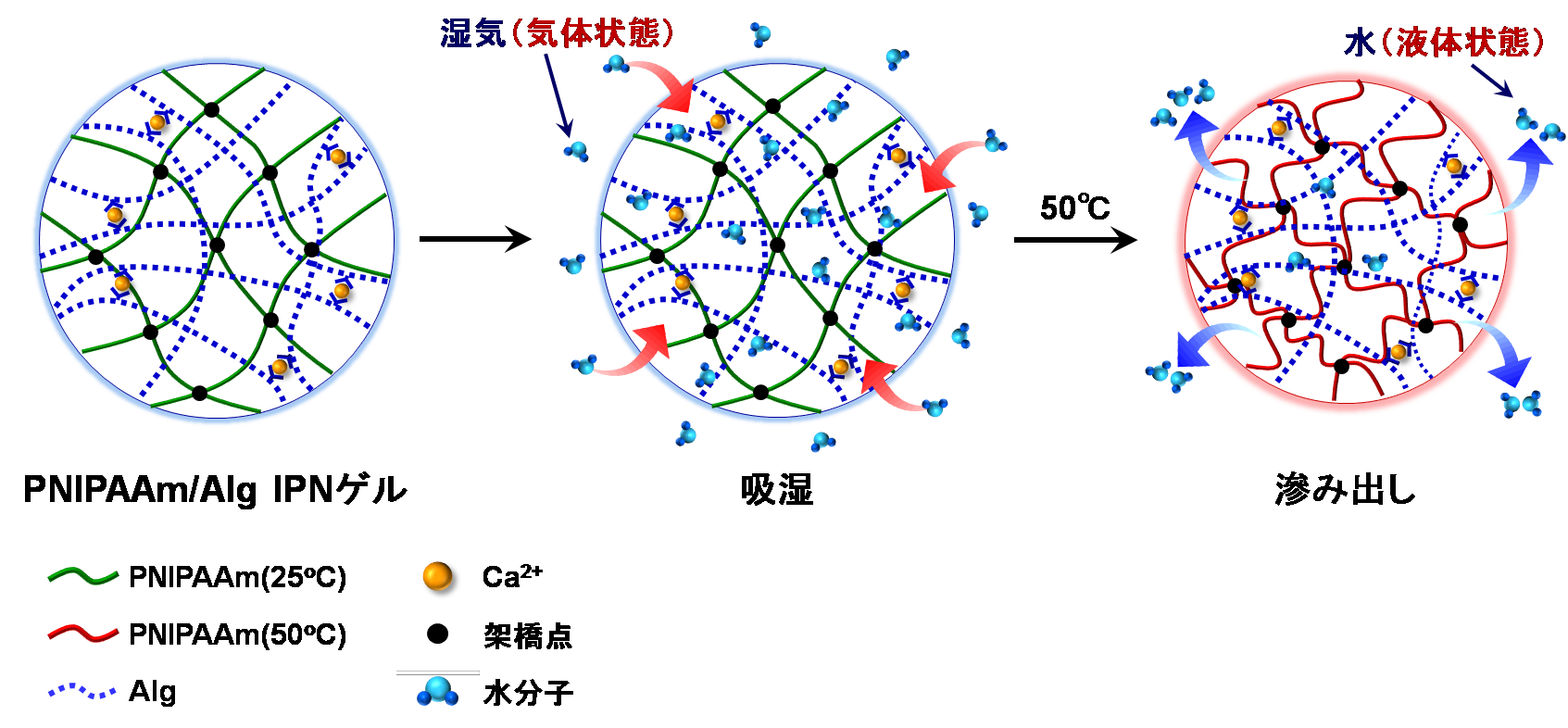 今回の温度応答性ゲルは、吸湿する成分として海藻に含まれる親水性のアルギン酸(Alg)と、水を滲み出させる温度応答性成分としてポリ(N-イソプロピルアクリルアミド)(PNIPAAm)とが相互に絡み合った相互侵入高分子網目(IPN)ゲルです【画像3】。ここで用いたPNIPAAmは32℃付近に下限臨界溶液温度(LCST)をもち、このLCST以下の温度では水に溶解しますが、LCST以上になると不溶になります。すなわち、LCST前後でPNIPAAm鎖は親水性から疎水性へと急激に変化するユニークな性質をもっています。その結果、PNIPAAm からなるゲルは、LCST以下の水中で膨潤し、LCST以上になると急激に収縮して体積相転移現象を示します。