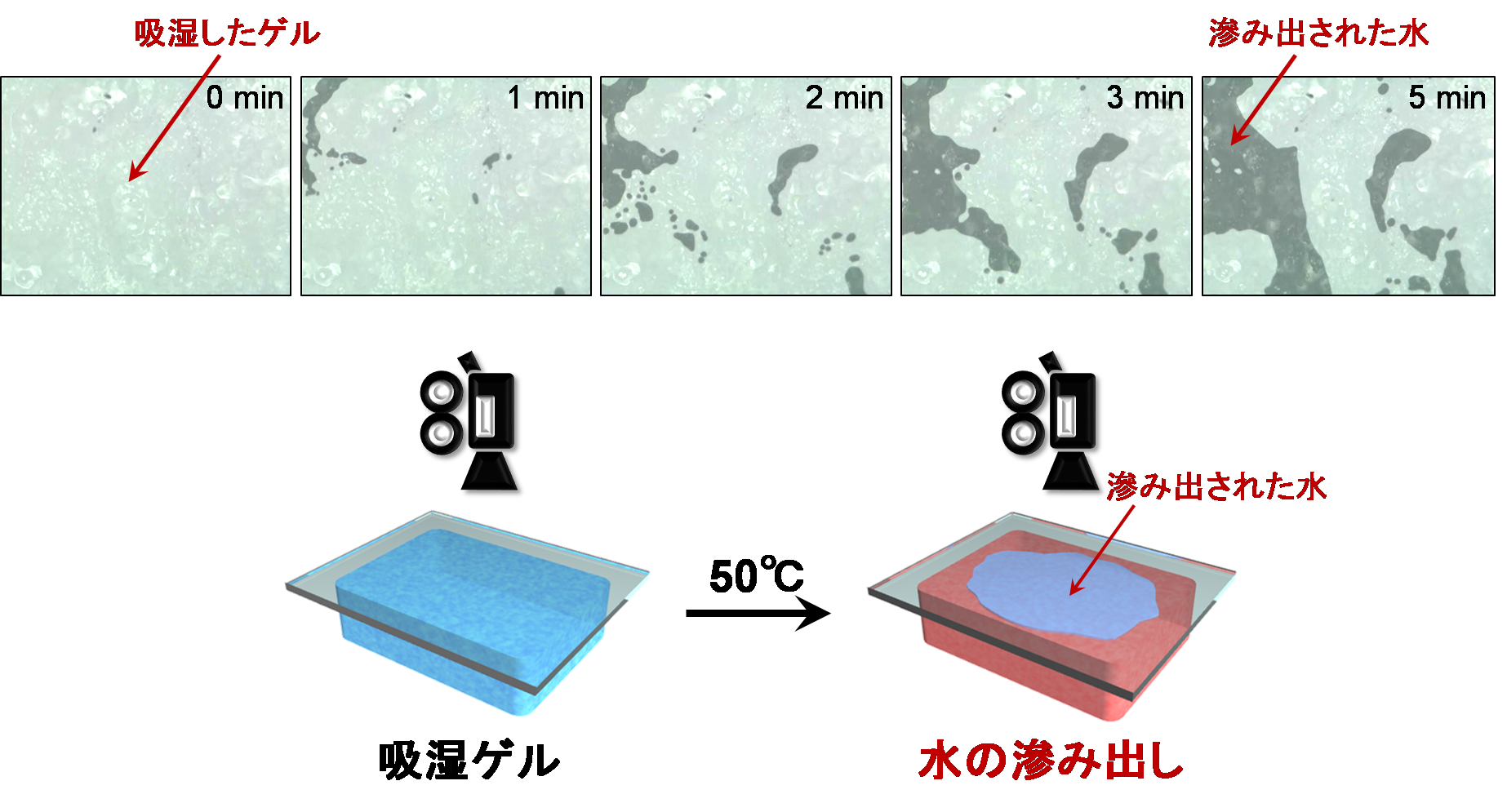 このスマートゲルは、室温付近において湿度の比較的高い環境下でよく吸湿しますが、吸湿したゲルを50℃に加温するとゲル表面から液体状態の水が滲み出てきます。また、温度のサイクル変化により吸湿と滲み出しの繰り返し操作が可能です。ゼオライトなどの乾燥剤を用いる通常の除湿システムでは、吸湿後に乾燥剤を 高温で 加熱再生するプロセスと、その過程で蒸発した水を凝縮するプロセスが必要であり、これらに多量のエネルギーを消費します。しかし、このスマートゲルを利用すると、わずかな加温により空気中に気体状態で存在する水(湿気)を液体状態の水として直接的に回収できます。そのため、高温加熱による乾燥剤の再生や水蒸気の凝縮などのプロセスが不要となり、小型・省エネルギーシステムの開発につながると期待できます。